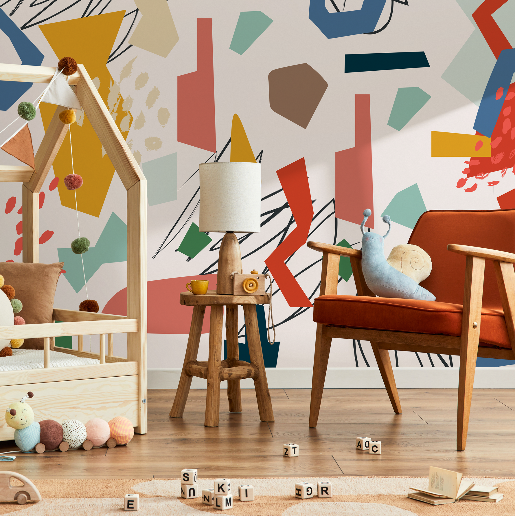 Transform your walls with our vibrant Abstract Wallpaper, featuring a colorful cutout motif in bold red, blue, and yellow. This playful wall art is perfect for creating a dynamic accent wall, infusing any room with energy and modern home decor. This peel and stick wallpaper brings a touch of artistic flair to your interior design, making it a standout piece of home decor.