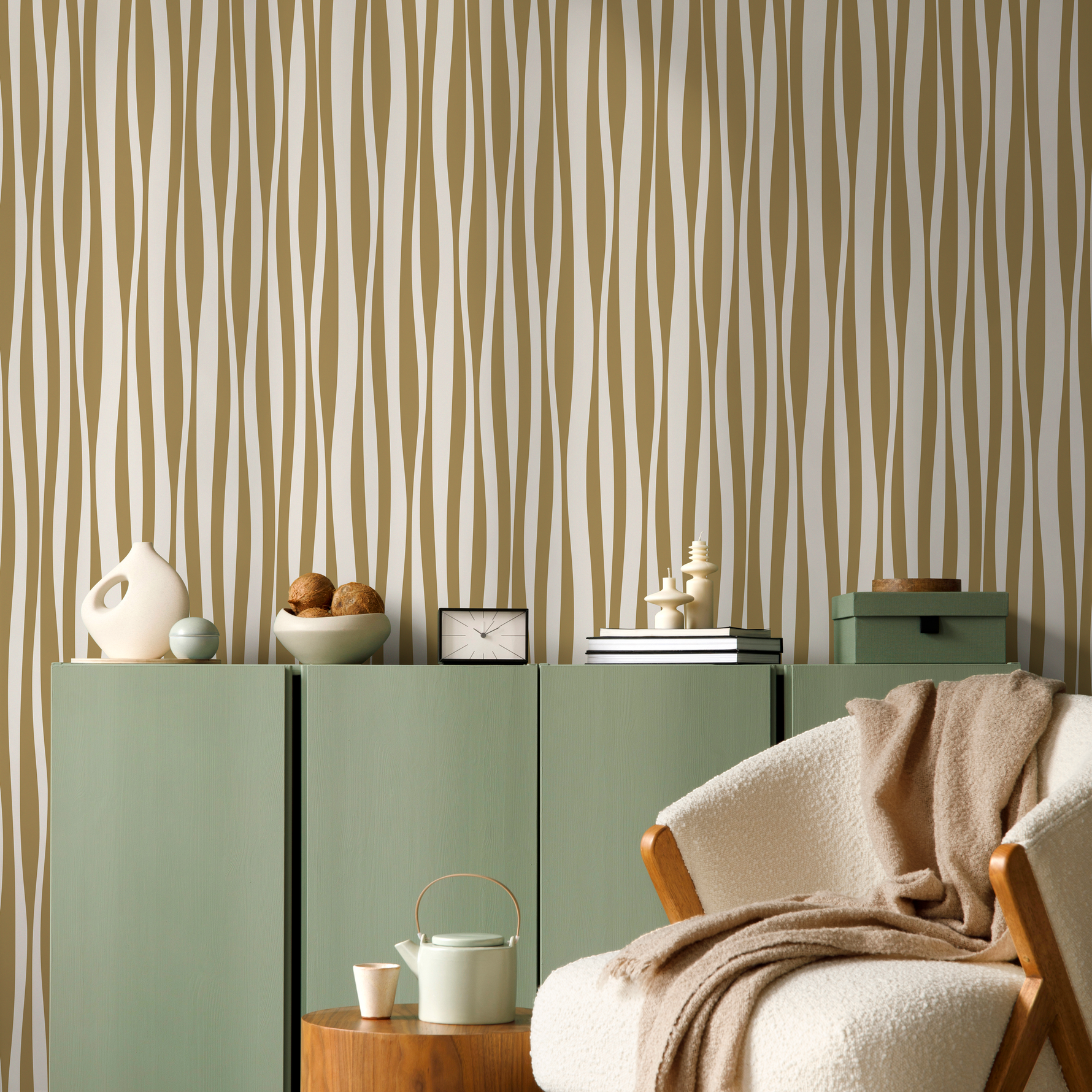Elevate your interior with our stunning Abstract Wallpaper, showcasing a sophisticated pattern of wavy vertical stripes. This design, rendered in a warm palette of mustard and cream, brings a sense of fluid motion and modern elegance to any room. Perfect for creating a captivating accent wall or transforming an entire space, this wallpaper serves as a dynamic piece of wall art that complements a contemporary aesthetic. The organic flow of the stripes adds visual interest and texture, making it a versatile choice for enhancing your home decor.
