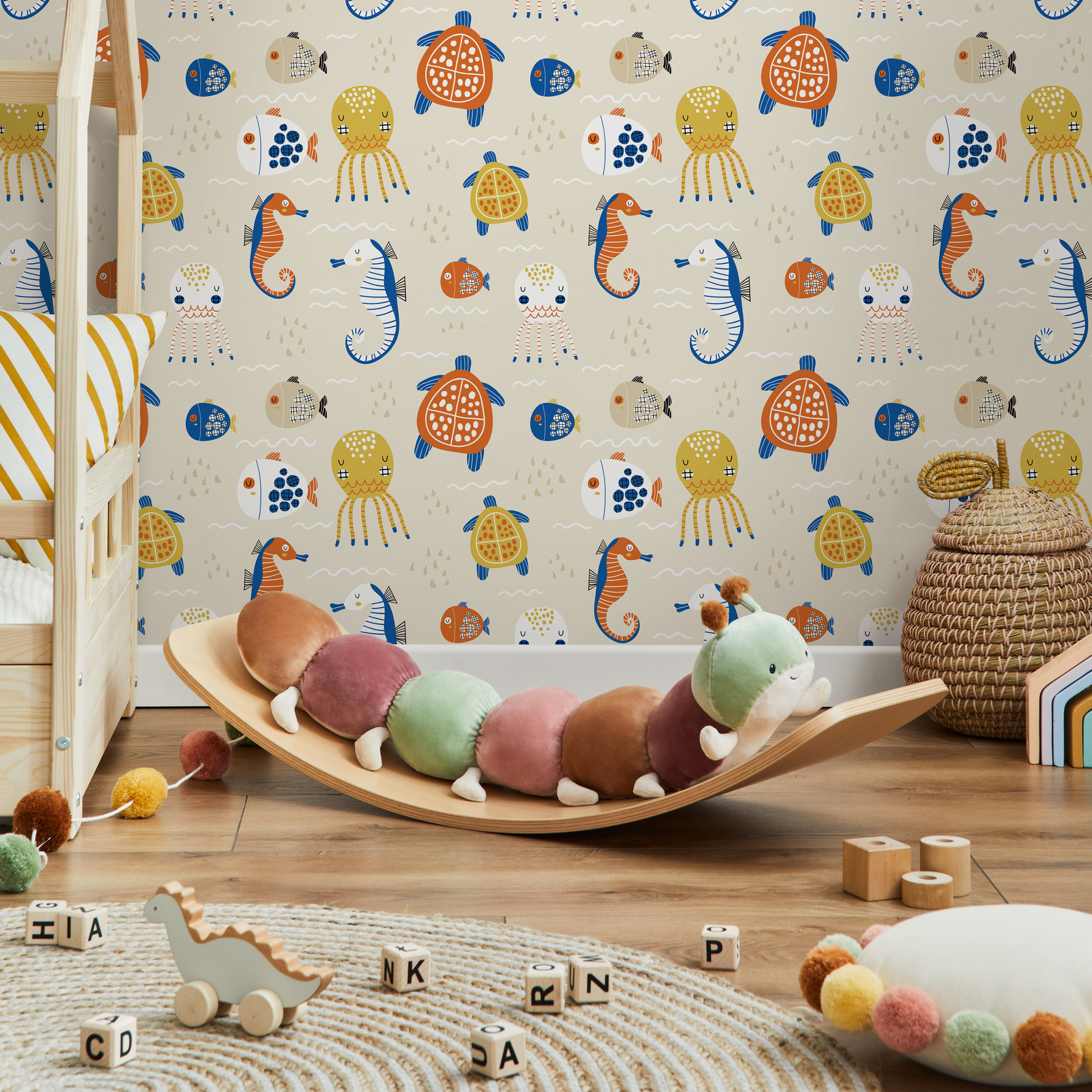 Introduce a world of underwater wonder with our Ocean Wallpaper, featuring charming folk art sea creatures. This delightful wall art captures the magic of the sea with its illustrative turtles, octopuses, and seahorses in cheerful shades of blue, orange, and yellow. Perfect for creating an enchanting nursery or playroom, this wallpaper transforms any room into a captivating aquatic adventure.