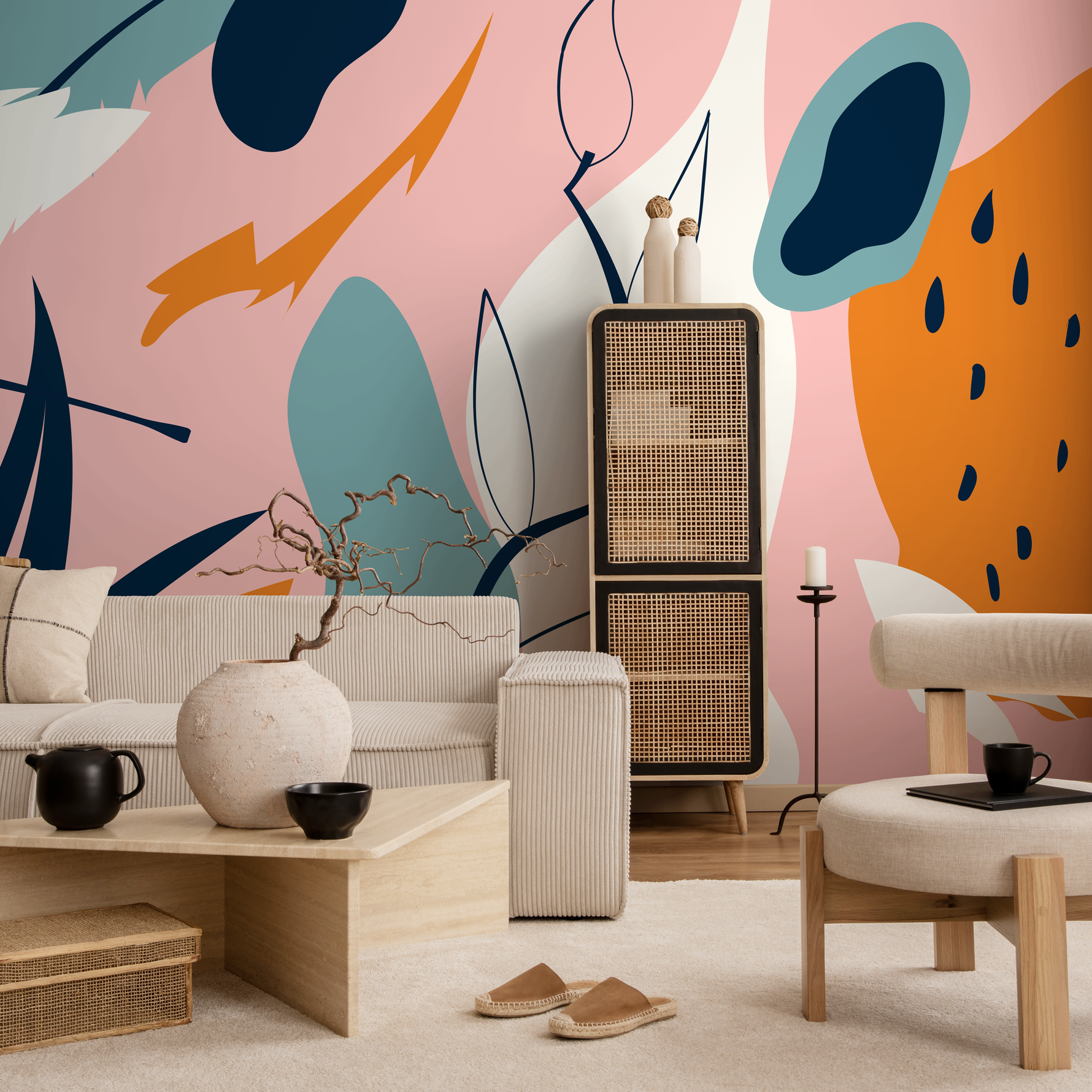 Introduce a bold statement into your home with this Abstract Wallpaper, featuring a dynamic collage of modern organic shapes. The vibrant design, rendered in a striking palette of Pink, Orange, and Blue, serves as a captivating piece of wall art that instantly energizes any room. This wallpaper is perfect for creating a stunning accent wall that reflects a contemporary and artistic sensibility, transforming your space from ordinary to extraordinary with its lively and expressive motif.