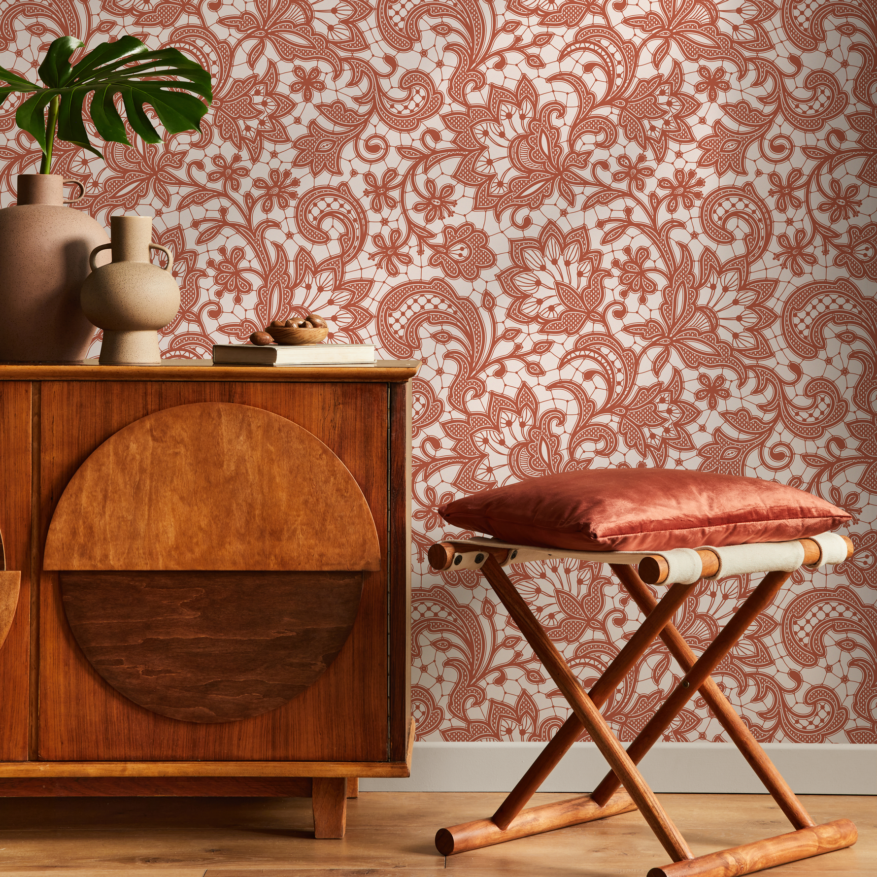 Introduce a touch of timeless elegance to your home with our Lace Wallpaper, featuring an intricate floral motif in a warm terracotta red. This ornamental wall art is designed to create a sophisticated and inviting atmosphere, instantly transforming any room into a refined sanctuary. The delicate, detailed pattern adds a layer of texture and depth, making it a perfect statement piece for your interior design project.