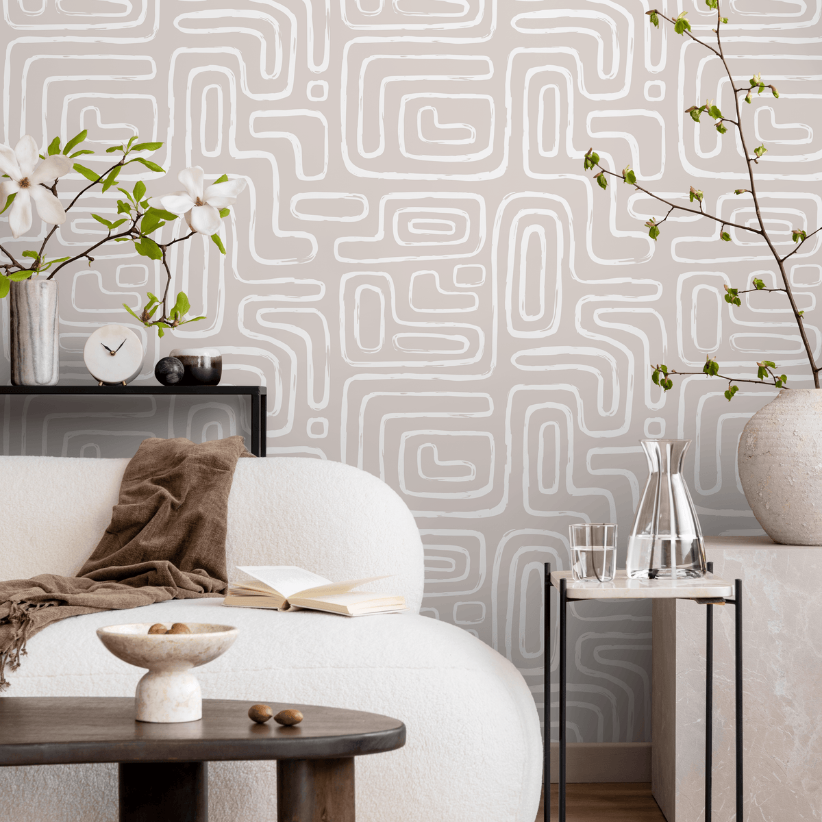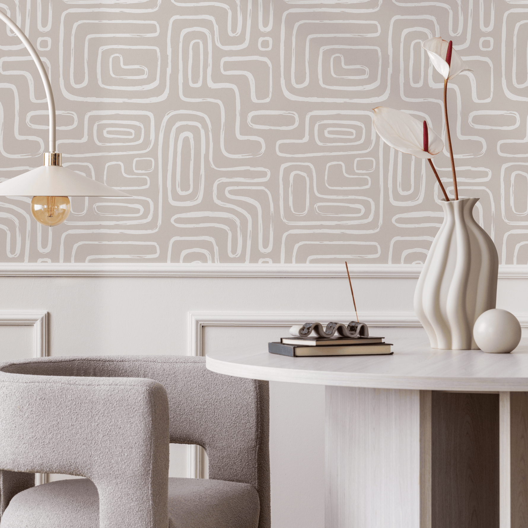 Papel pintado de líneas redondeadas sin costuras, autoadhesivo, extraíble, reposicionable, neutro, minimalista, ligero, abstracto, pinceladas boho modernas - ZAAG