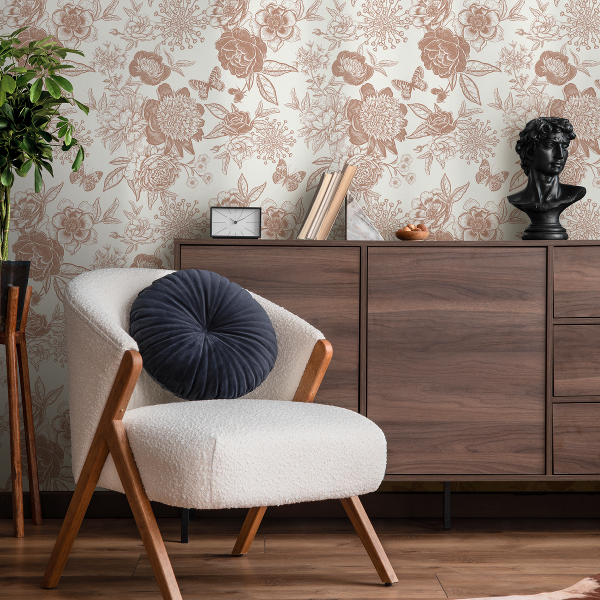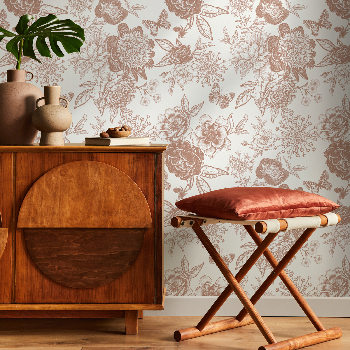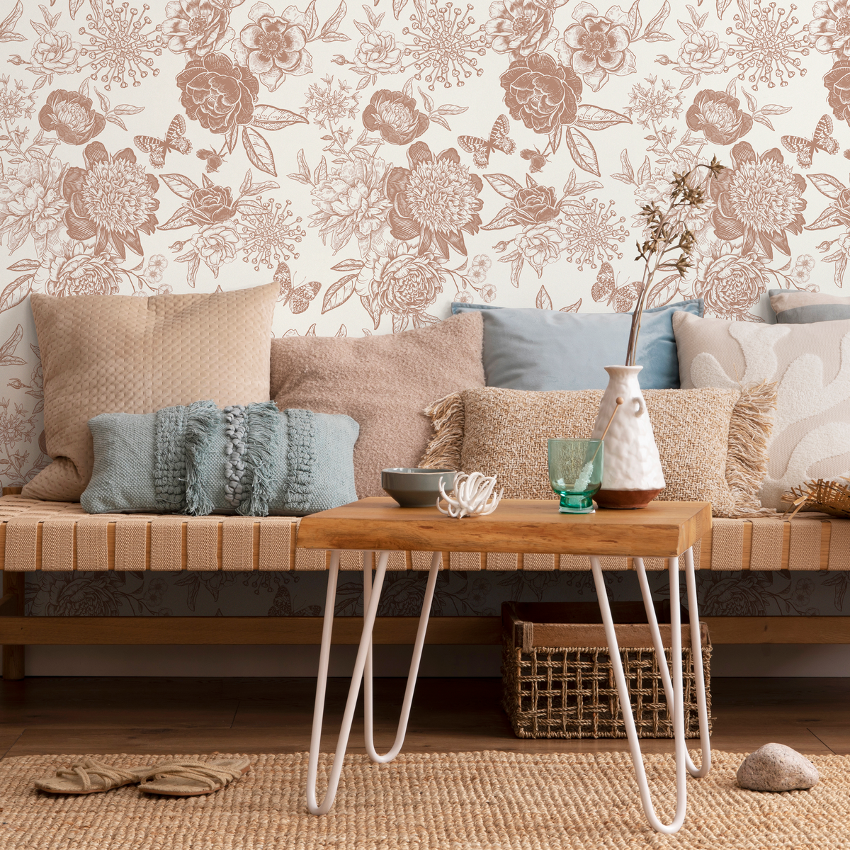 Papel pintado de rosas bohemias, papel pintado de peonías bohemias, autoadhesivo, reposicionable y minimalista, color naranja quemado - ZACG