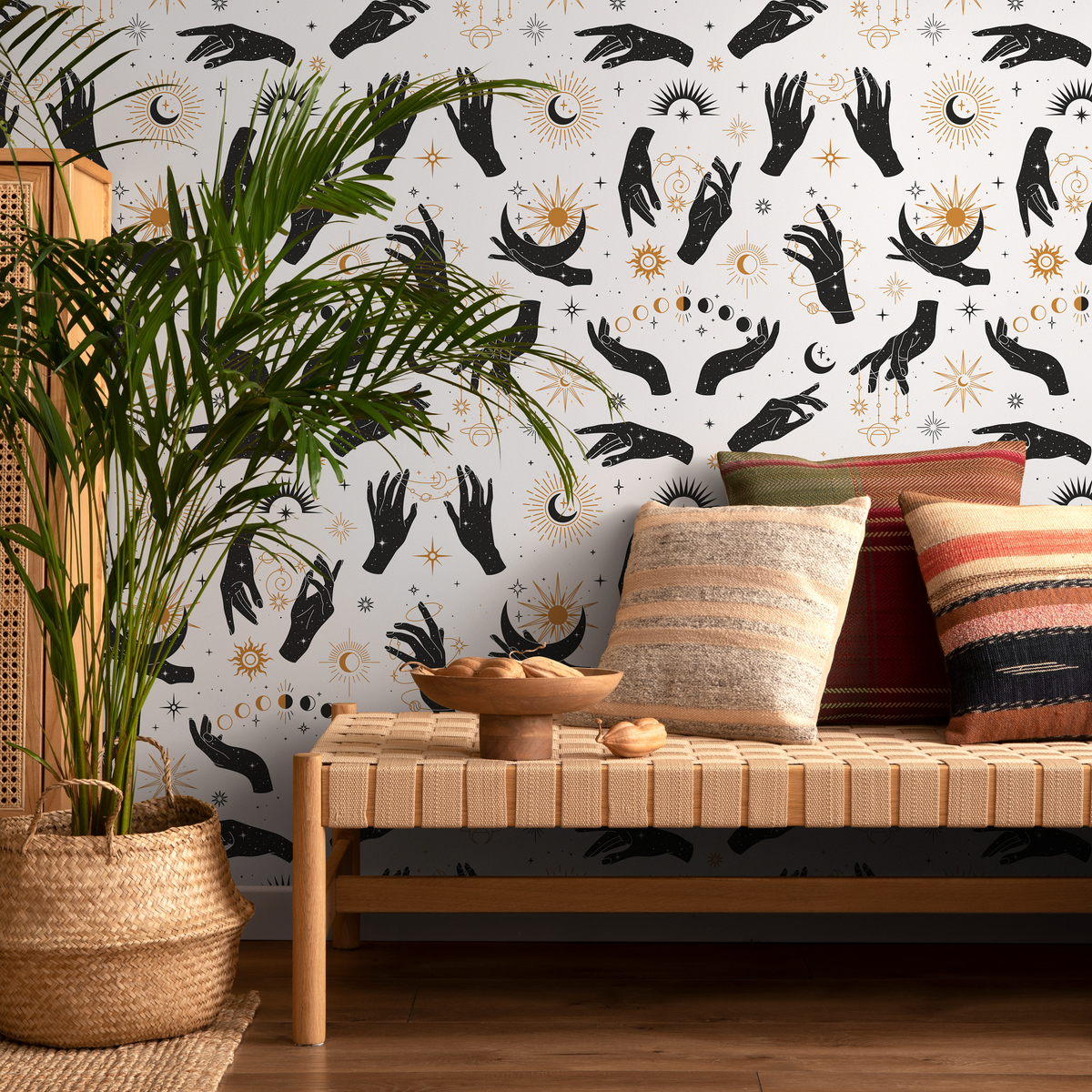 Papel tapiz autoadhesivo removible con diseño de manos bohemias, sol y luna, reposicionable - ZABF