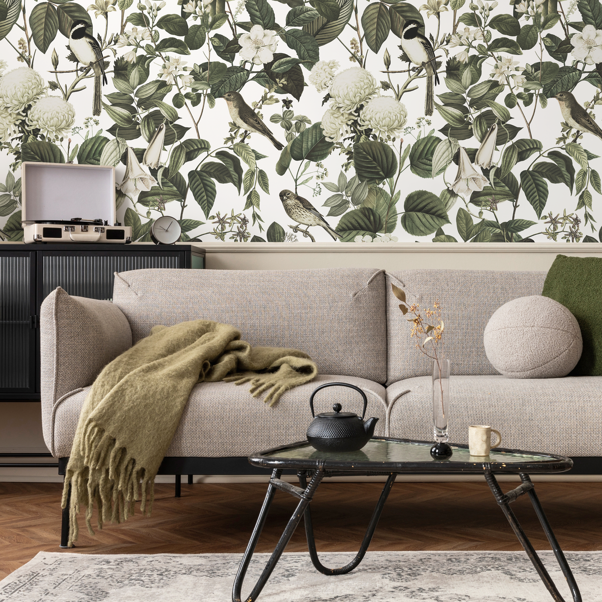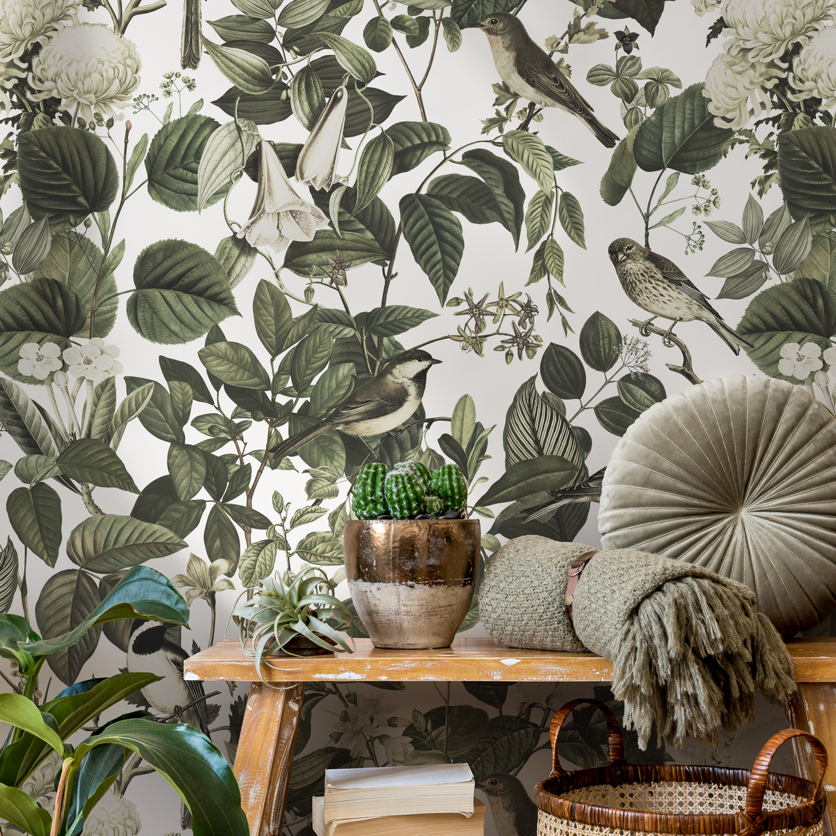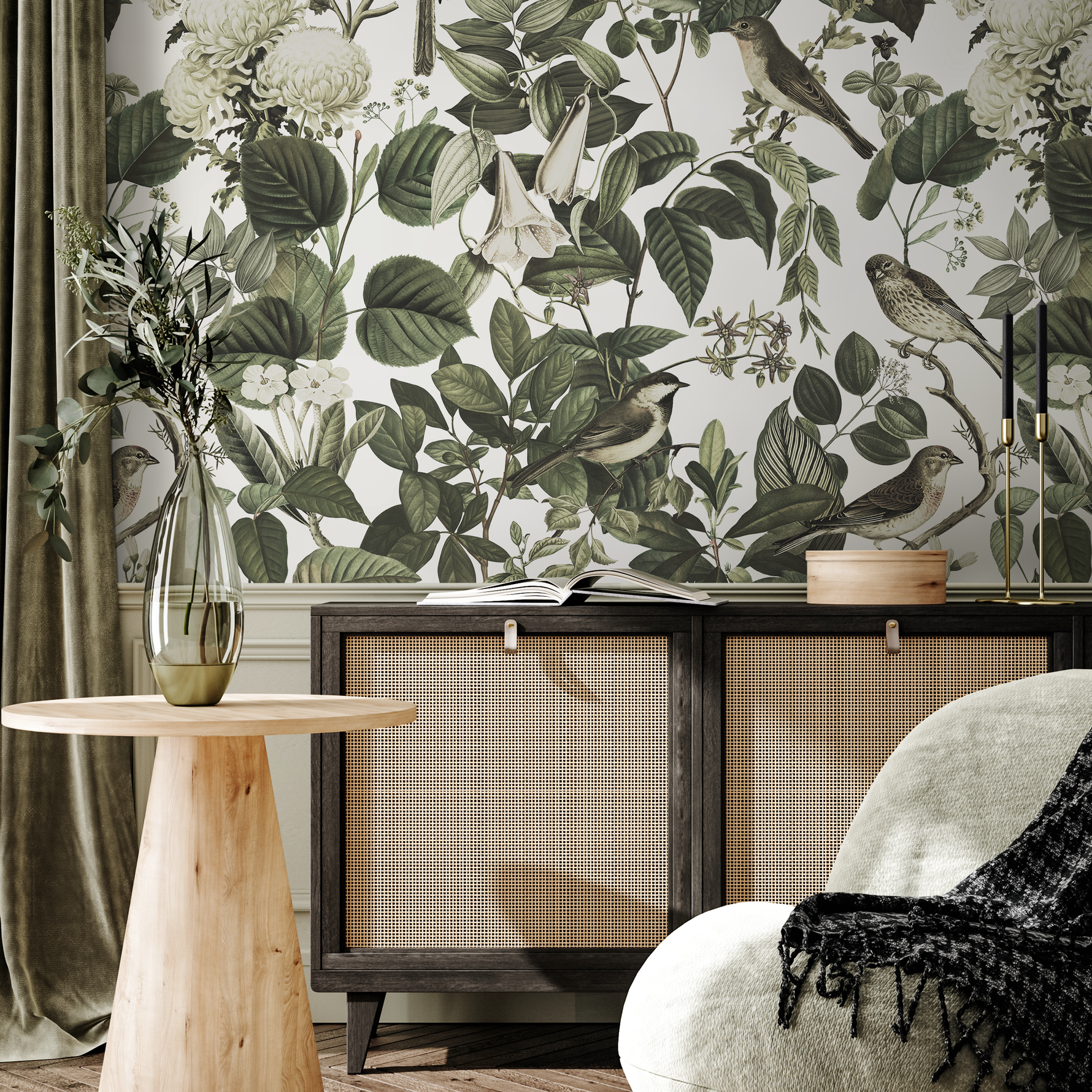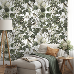 Introduce timeless elegance to your space with this Botanical Wallpaper, featuring a sophisticated design of vintage birds and blooms. The stunning composition, rendered in a serene palette of green, cream and white, draws inspiration from classic chinoiserie art, creating a peaceful and enchanting atmosphere. This nature-inspired wall art is perfect for anyone looking to add a touch of classic charm and natural beauty to their interior design.