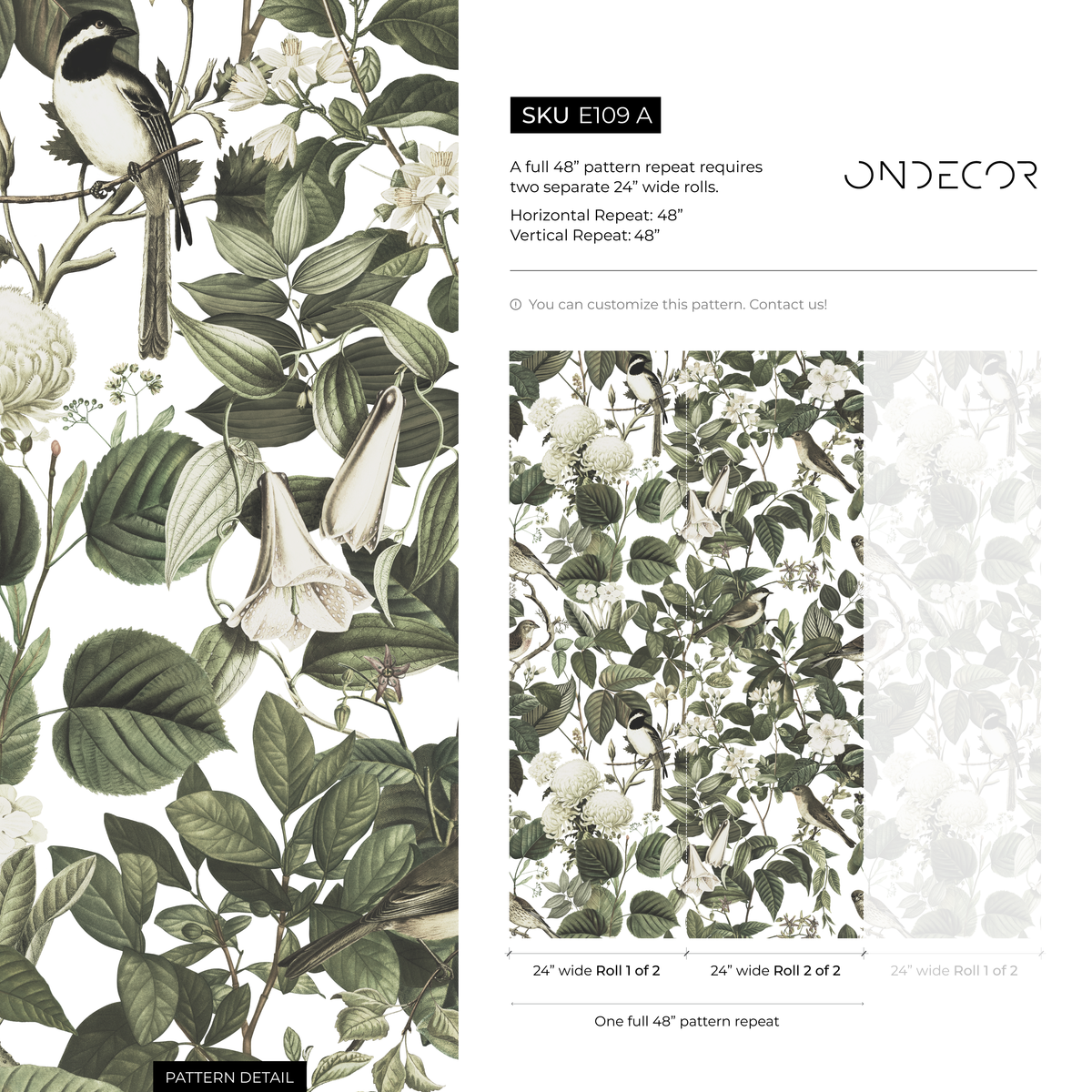 Botanical Wallpaper Featuring Vintage Birds and Blooms in Green and White - E109 A