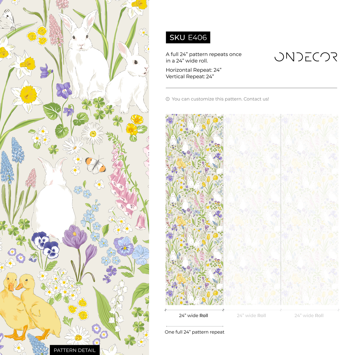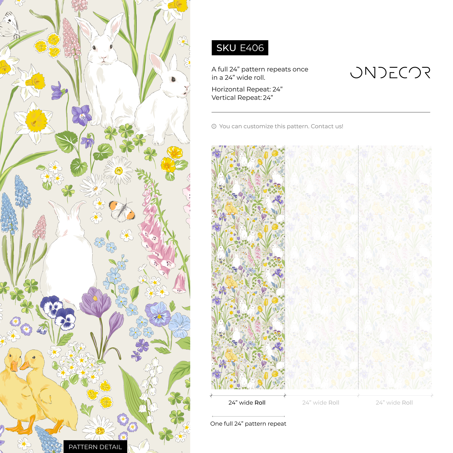 Elevate your interior design with this stunning peel and stick wallpaper, designed for effortless application and removal. As a removable wallpaper, it's a fantastic solution for renters or anyone seeking a temporary yet impactful home decor update. The detailed illustrations of bunnies, ducklings, and florals make it a versatile wall art piece that complements nurseries, children's rooms, or any space in need of a whimsical touch. This floral wallpaper for home decor seamlessly blends classic charm with modern convenience.