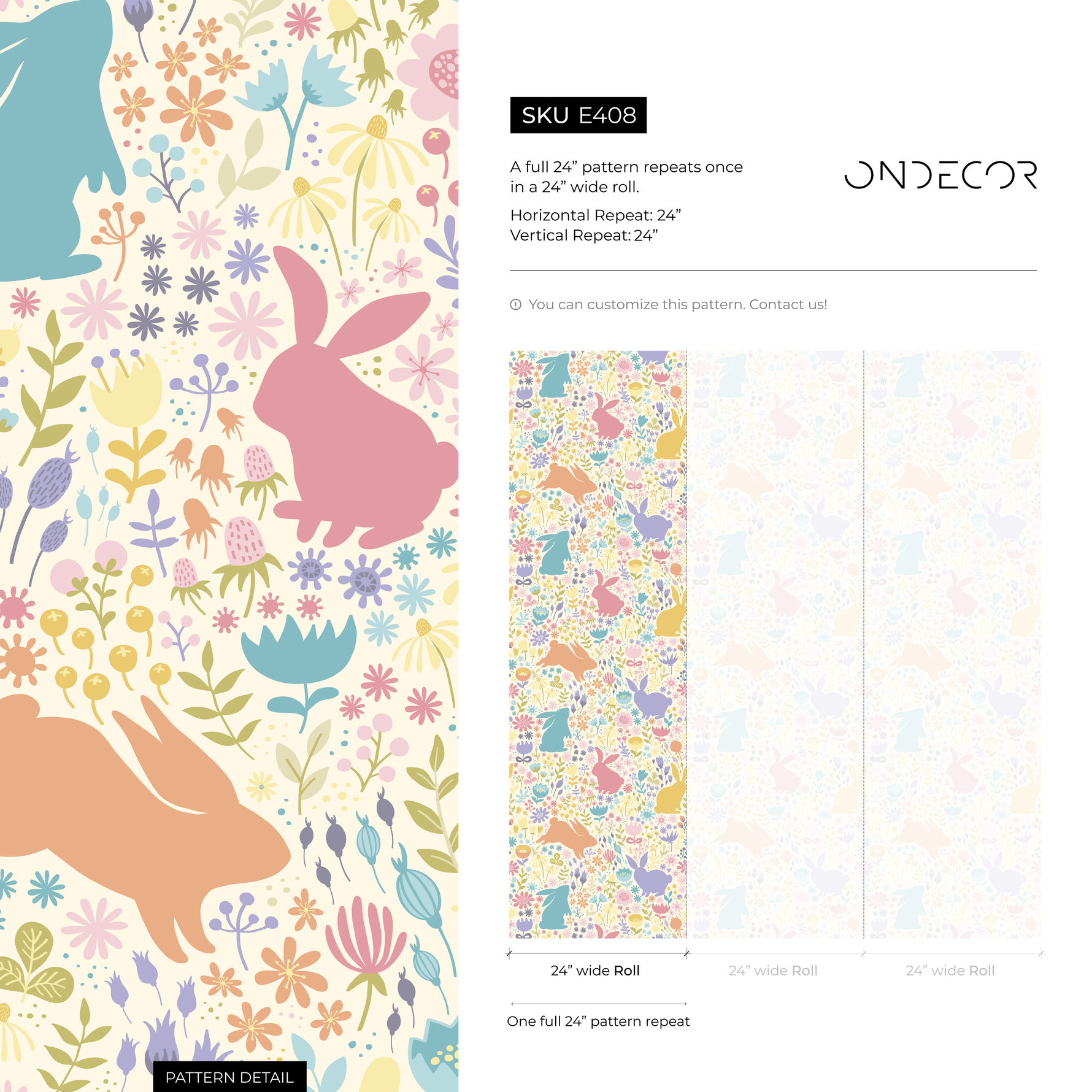 Introduce a touch of whimsy to your home with our charming Animal Wallpaper, featuring a delightful pattern of bunnies and wildflowers. This enchanting design, rendered in soft shades of pink, blue, and yellow, creates a cheerful and inviting atmosphere perfect for any space seeking a playful update. The intricate folk-art-inspired floral elements and sweet rabbit silhouettes make this wallpaper a standout piece of wall art.