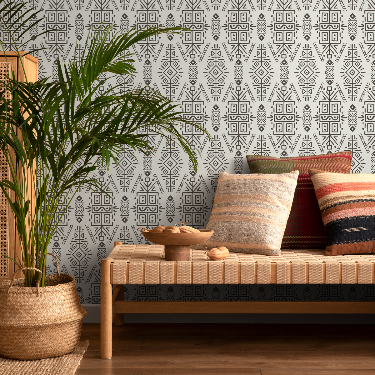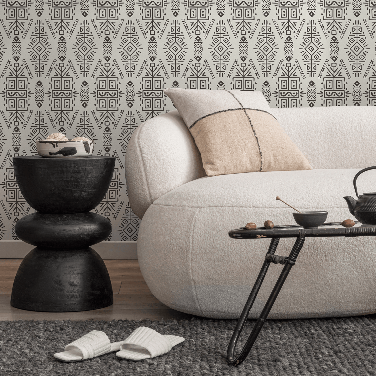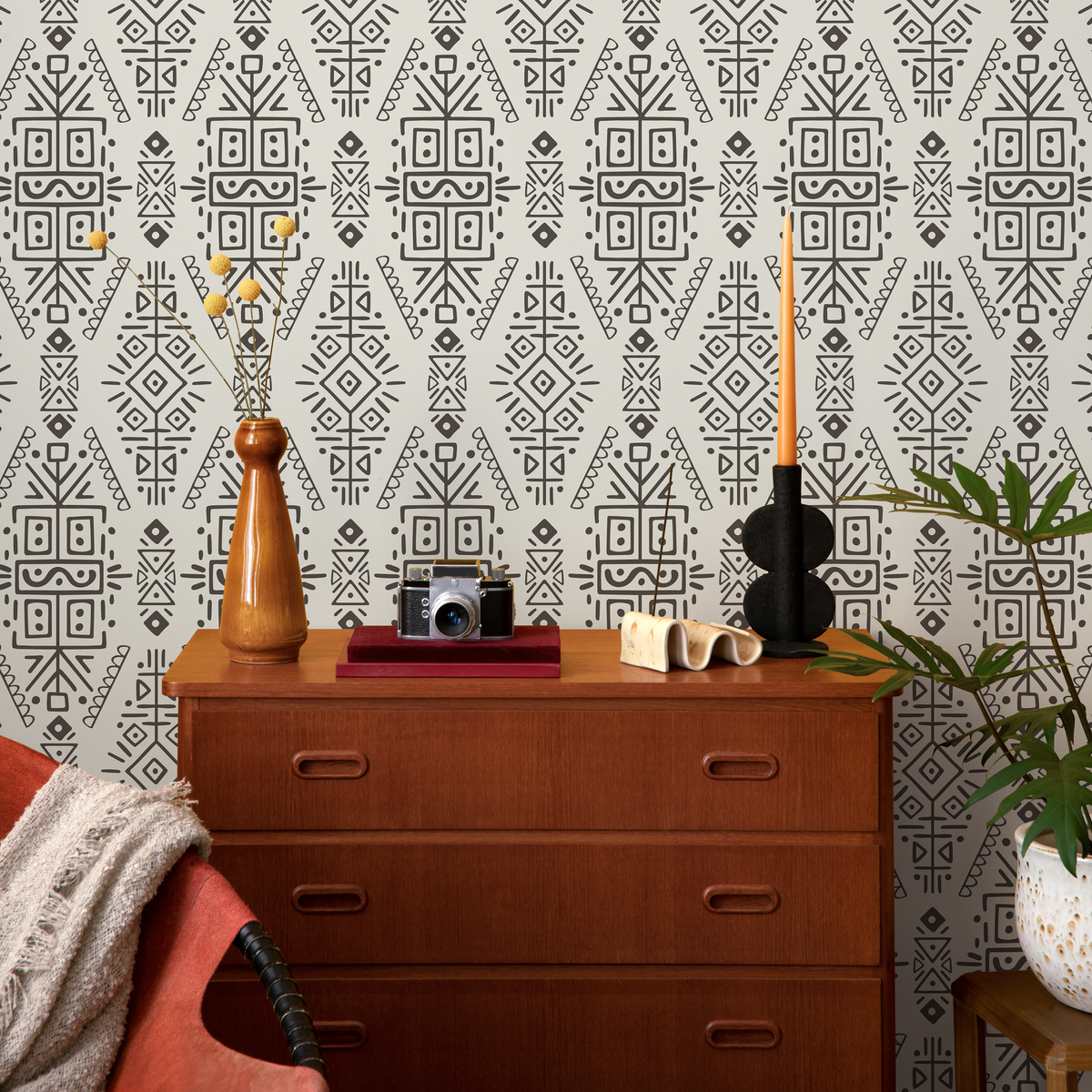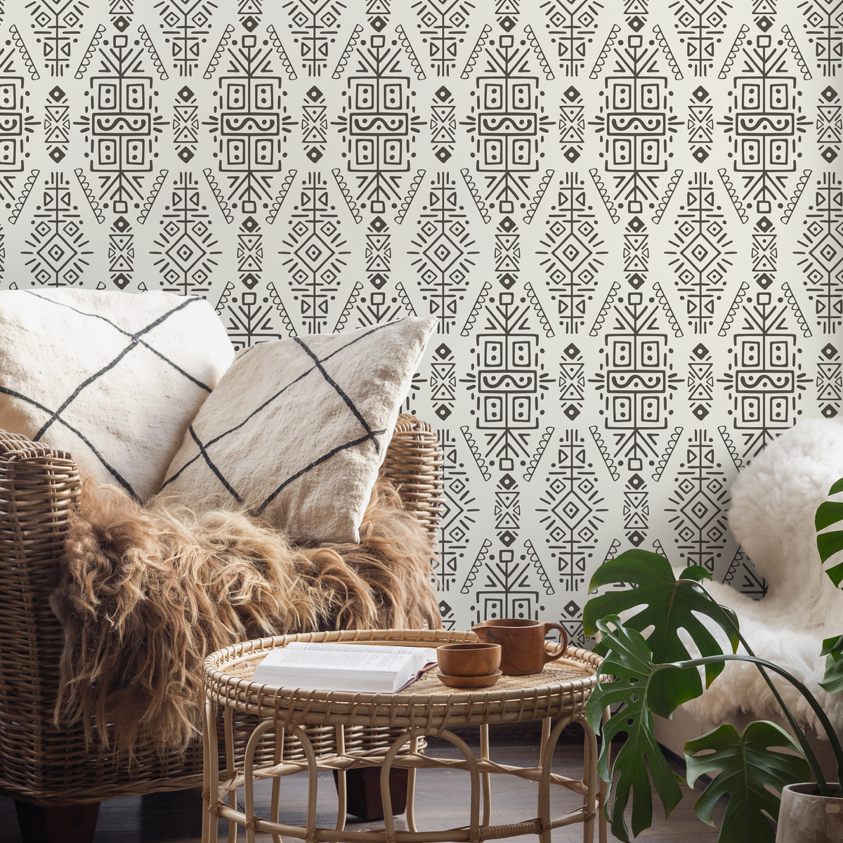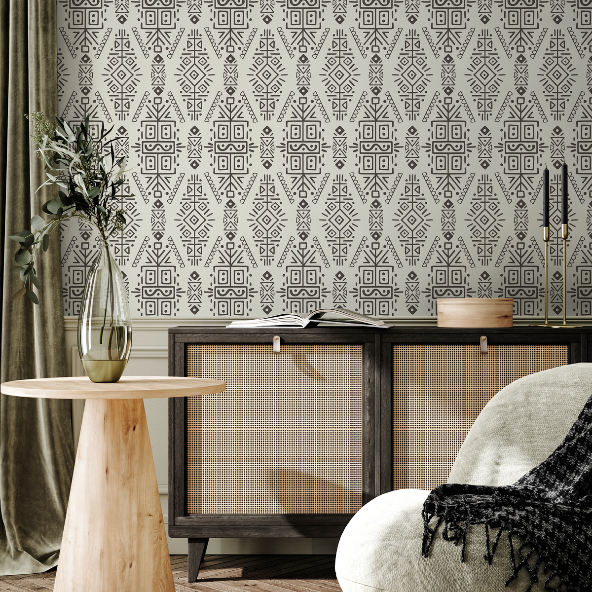 Papel tapiz autoadhesivo, papel tapiz extraíble, decoración del hogar, arte de pared, decoración de habitaciones, papel tapiz étnico tribal beige y negro - C607