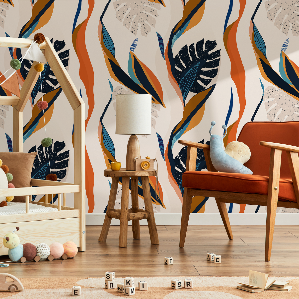 Papier peint autocollant amovible, décoration d'intérieur, art mural, décoration de chambre / Papier peint bohème orange et bleu marine - C333