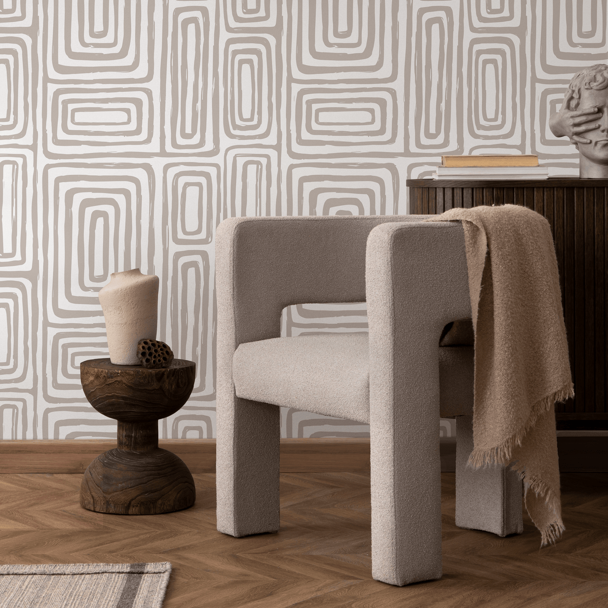 Papier peint à motif labyrinthe brossé, neutre et chaud, amovible, repositionnable, minimaliste, abstrait, bohème, beige et blanc - ZAAA