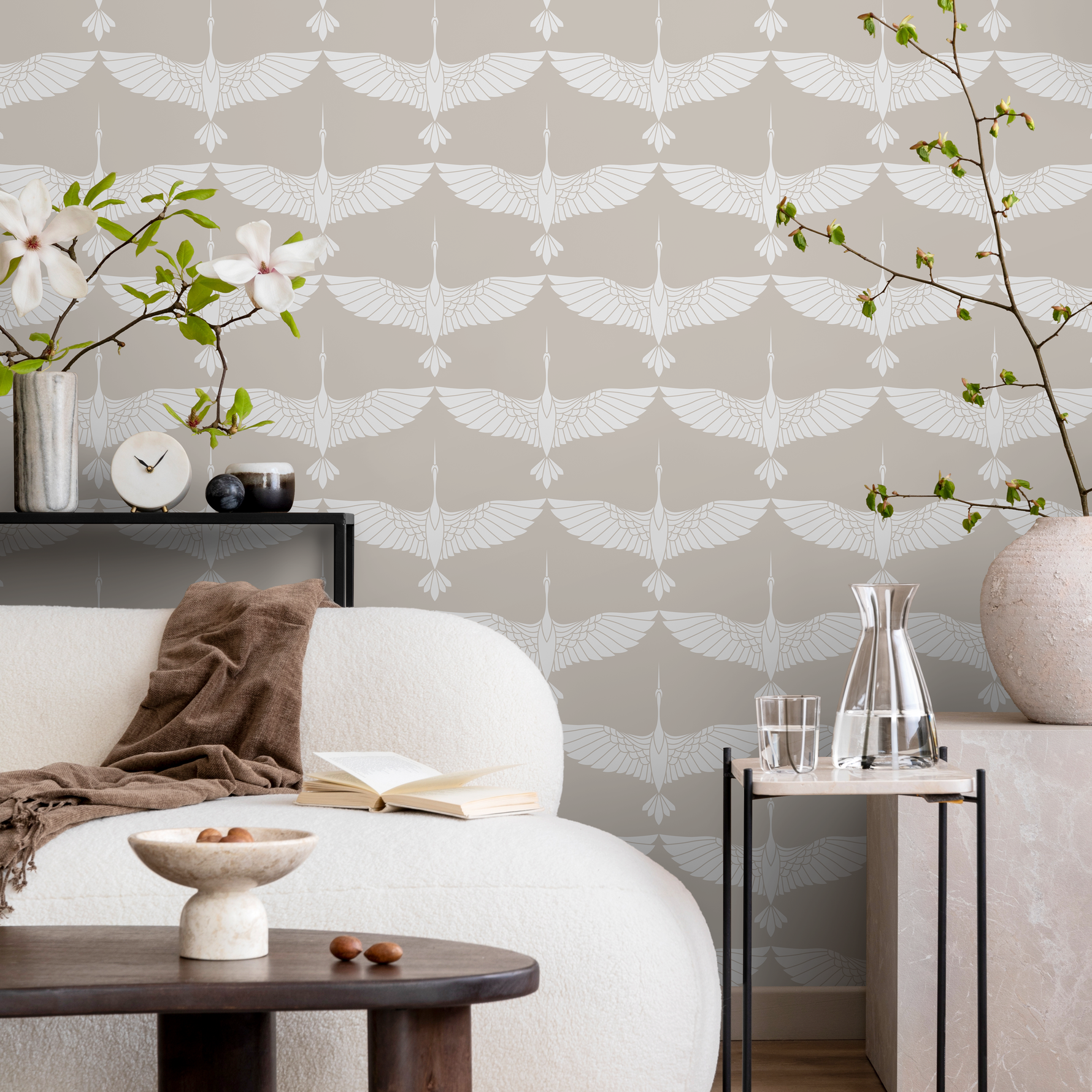 Papier peint grues du milieu du siècle, papier peint crème cygnes Art déco / papier peint autocollant, papier peint amovible, décoration murale pour la maison - CC-D085