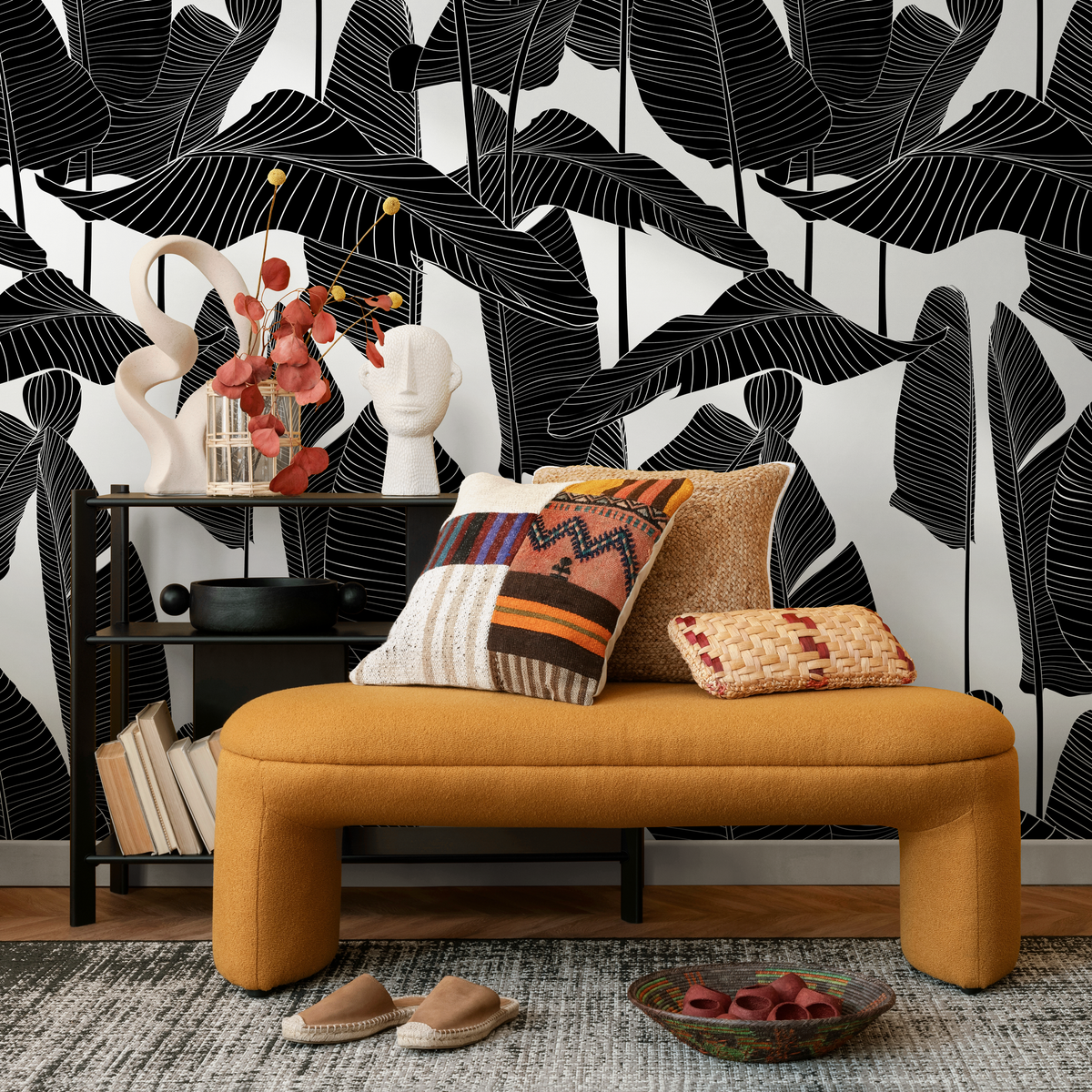 Papier peint autocollant amovible, décoration d'intérieur / Papier peint feuille de bananier noir et blanc, style bohème tropical - B097