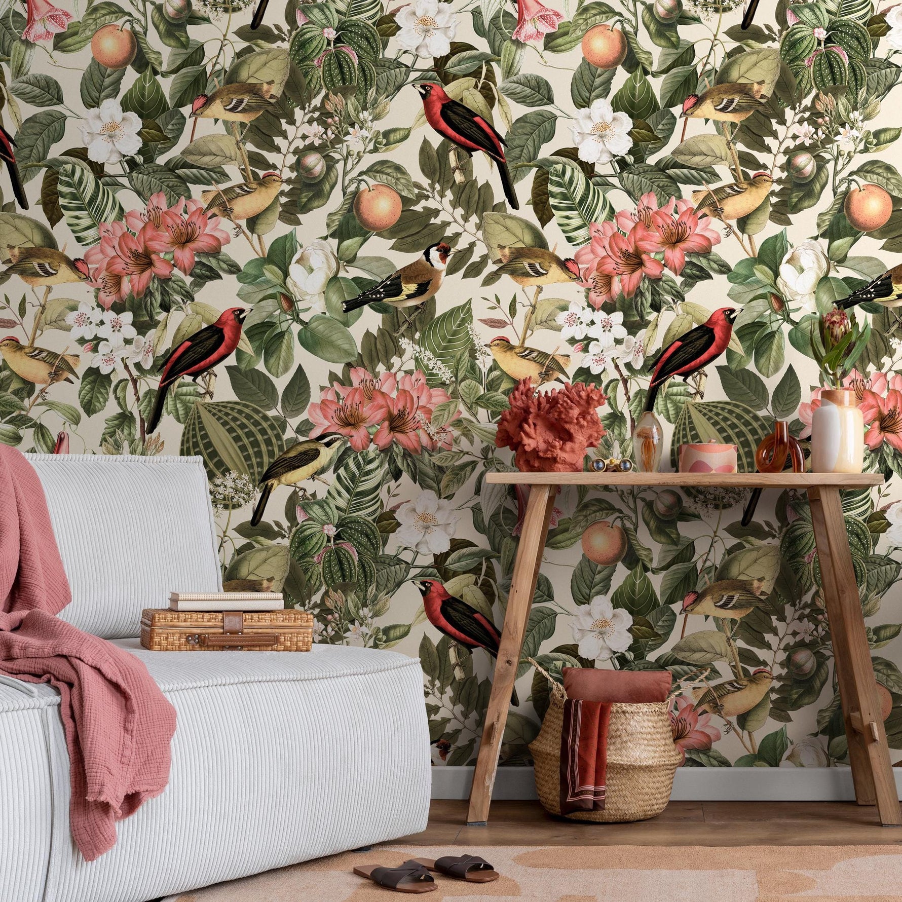 Botanical Wallpaper with Vintage Birds and Lush Florals in Green, Pink, and Red - E100