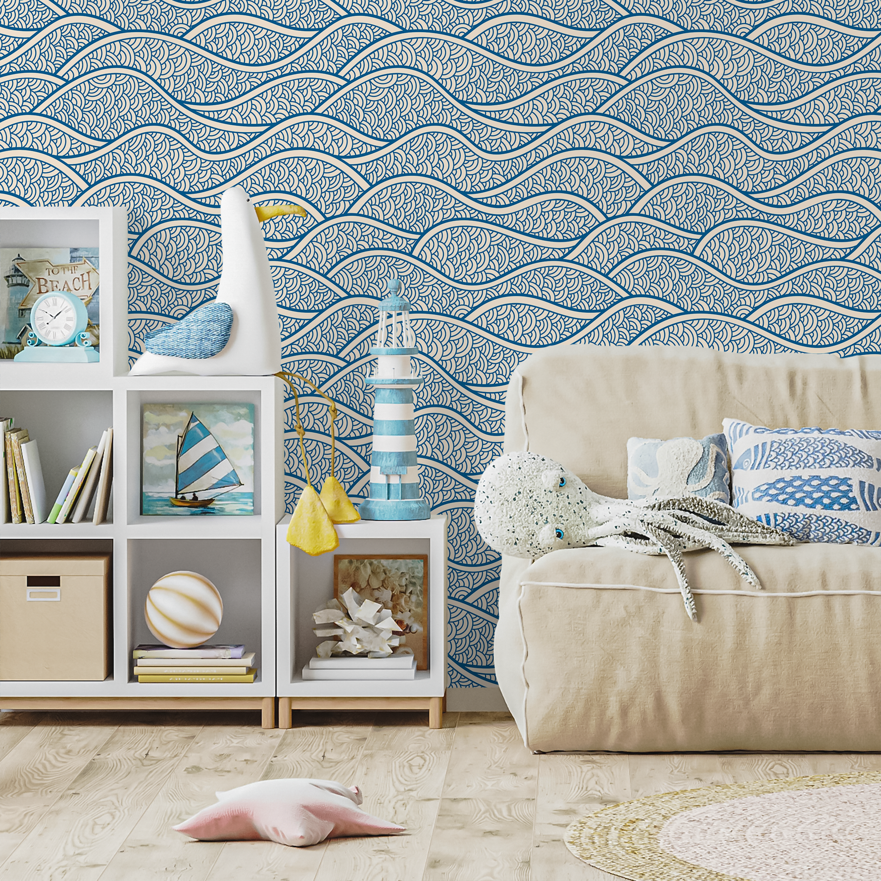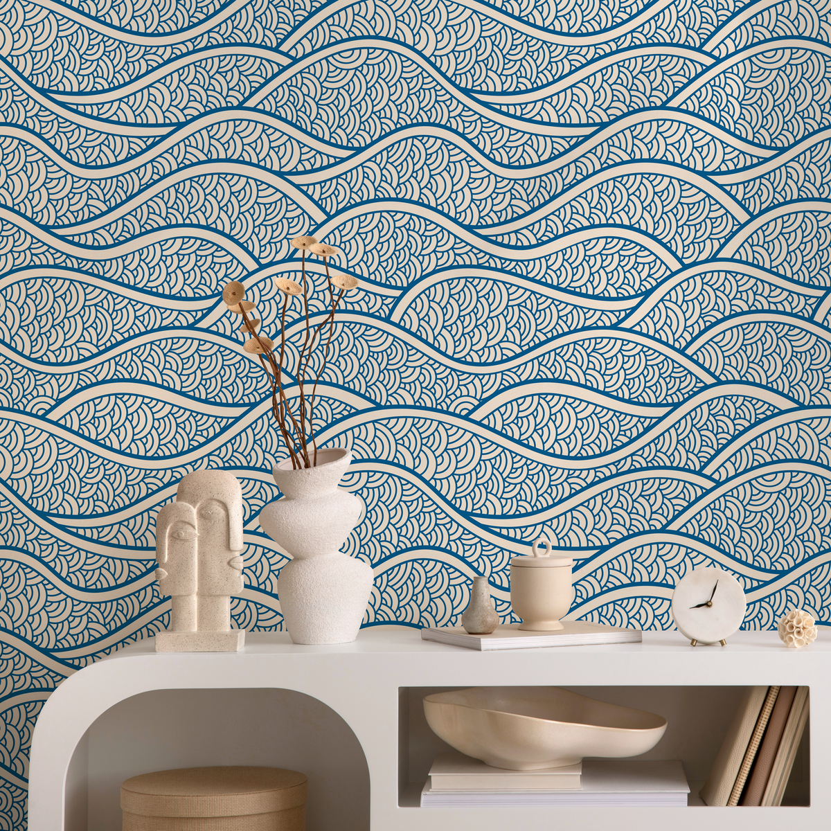 Papier peint amovible, papier peint scandinave, papier peint à vagues bleues, papier peint autocollant - E001
