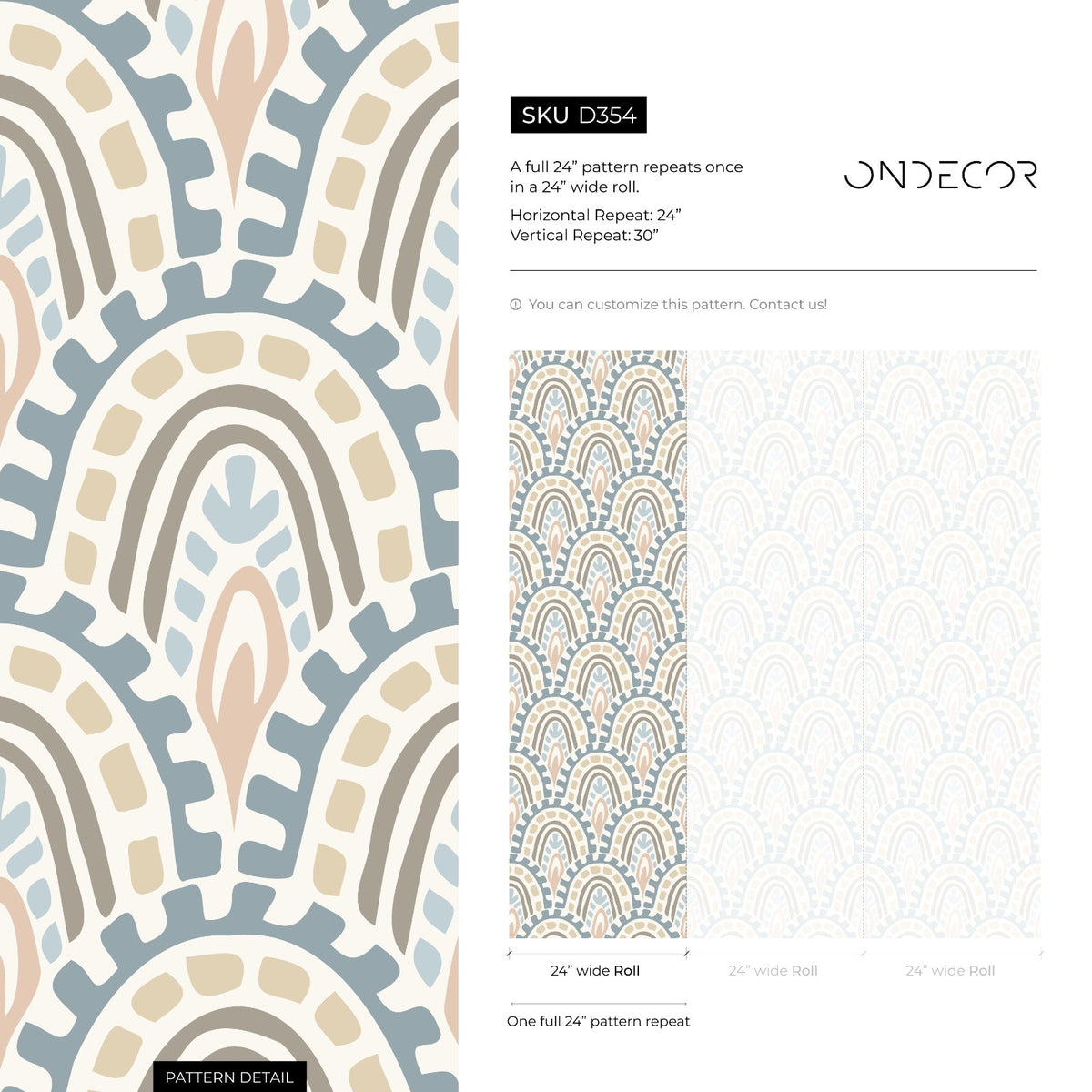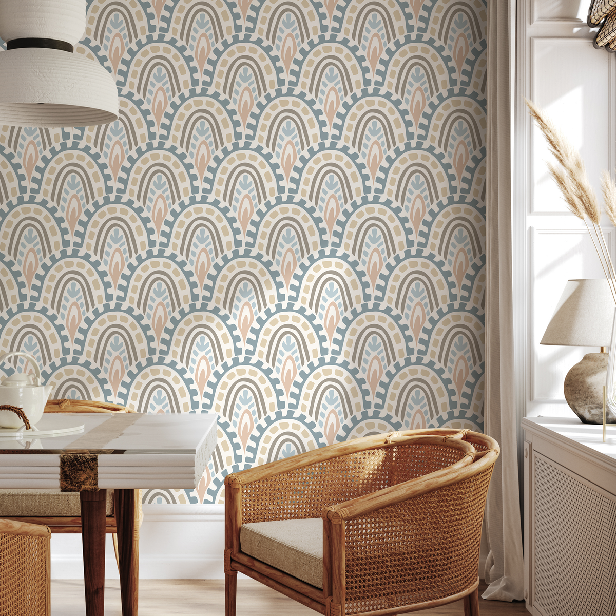 Abstract Wallpaper with a Bohemian Arch Motif in Blue, Pink, and Beige - D354