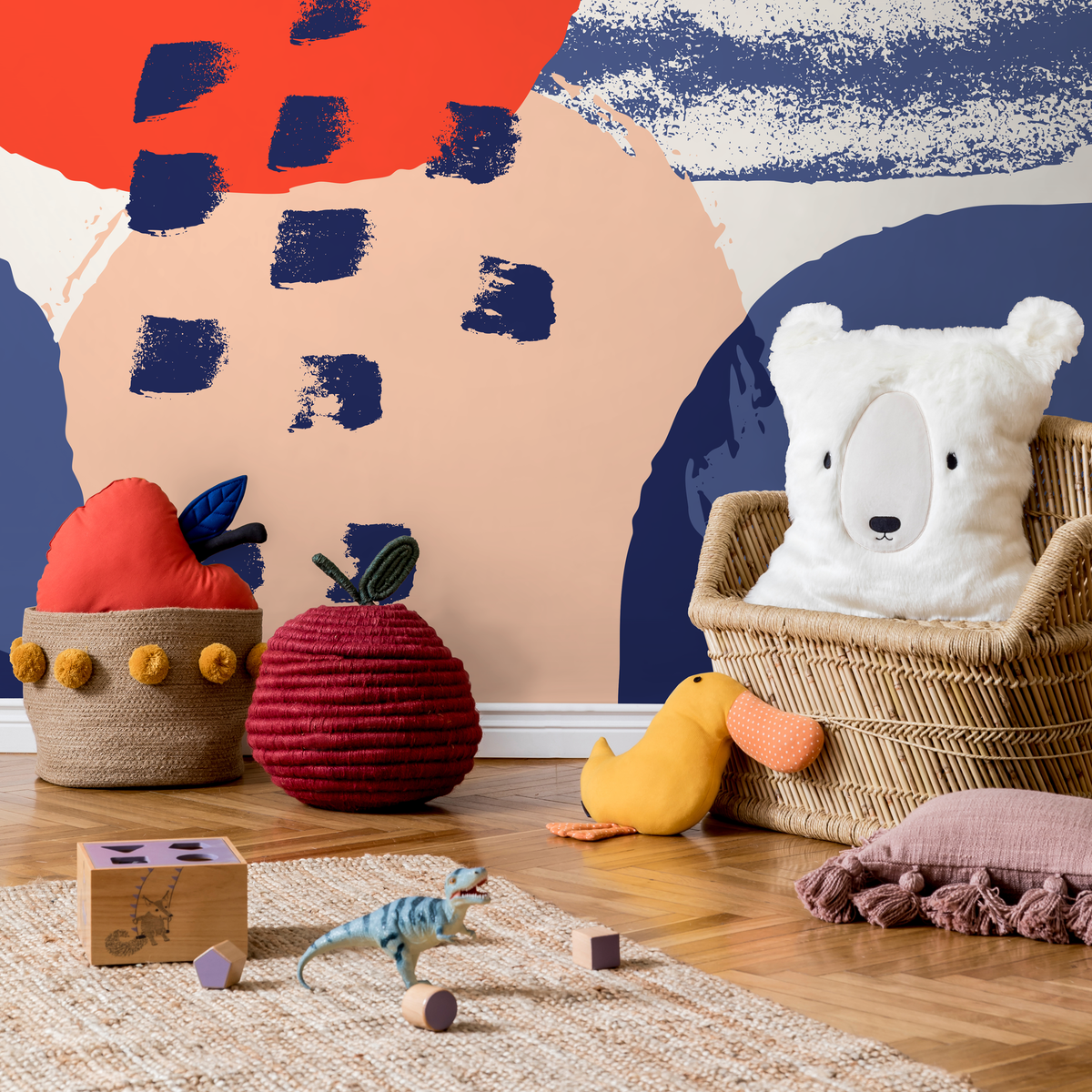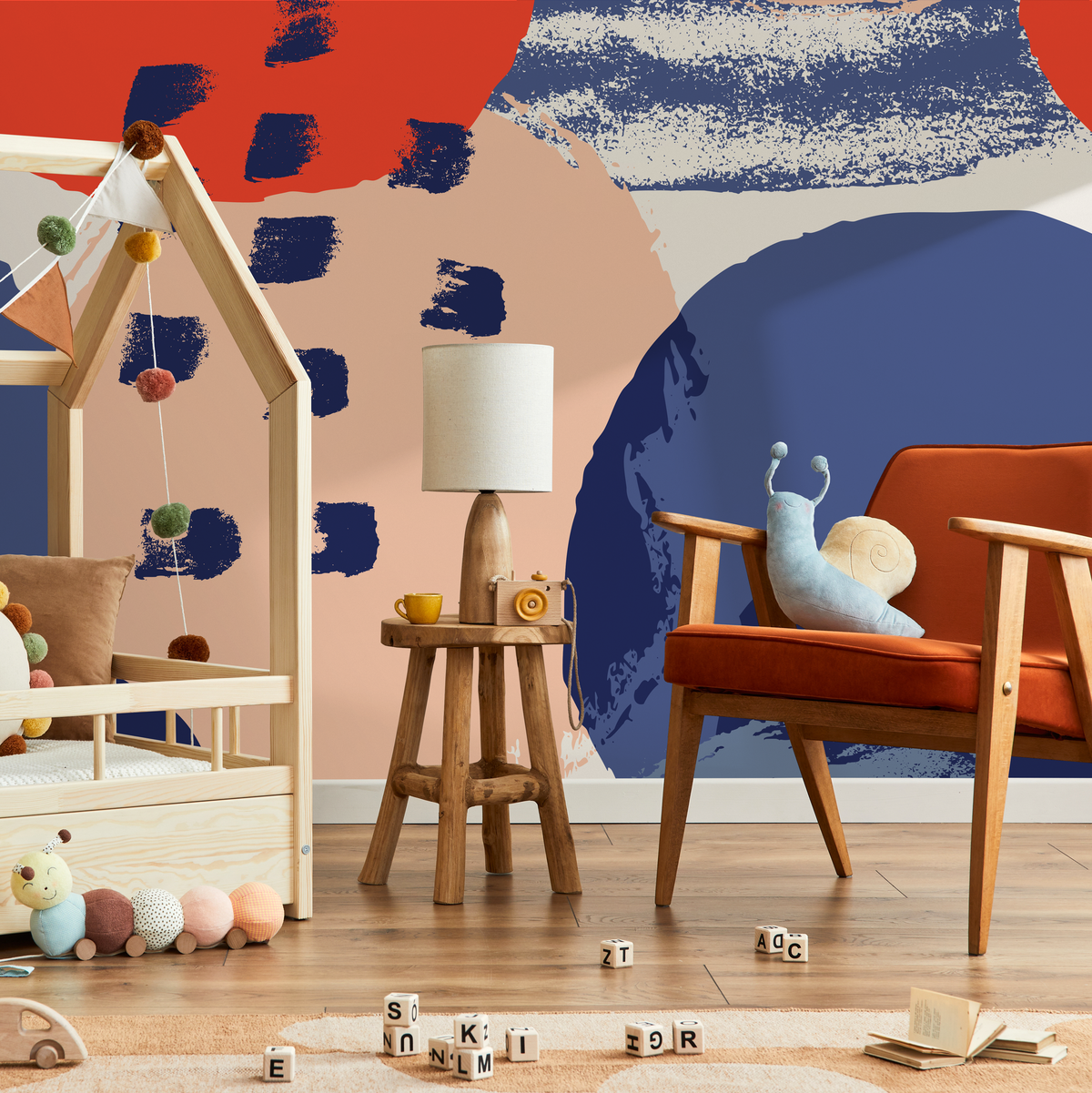Introduce a gallery-worthy statement to your home with our Abstract Wallpaper, featuring bold brushstrokes and layered shapes. This contemporary wall art combines dynamic forms in a striking palette of red, blue, and peach, creating a powerful visual impact perfect for modern interior design. The textured appearance and organic motifs make this mural a unique centerpiece for any room, instantly elevating your home decor.