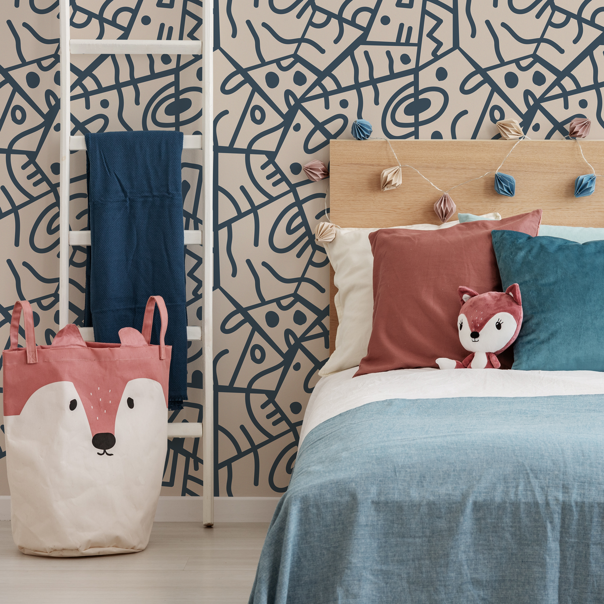 Introduce a bold, artistic statement into your home with this Abstract Wallpaper, featuring a captivating ethnic motif. The design showcases an intricate network of bold tribal lines in a sophisticated Navy Blue, set against a warm Taupe background. This stunning wall art is perfect for creating a dynamic accent wall or transforming an entire room, lending a unique, handcrafted feel to your interior design. Its versatile pattern bridges the gap between modern art and timeless ethnic inspiration, making it a powerful choice for contemporary home decor.