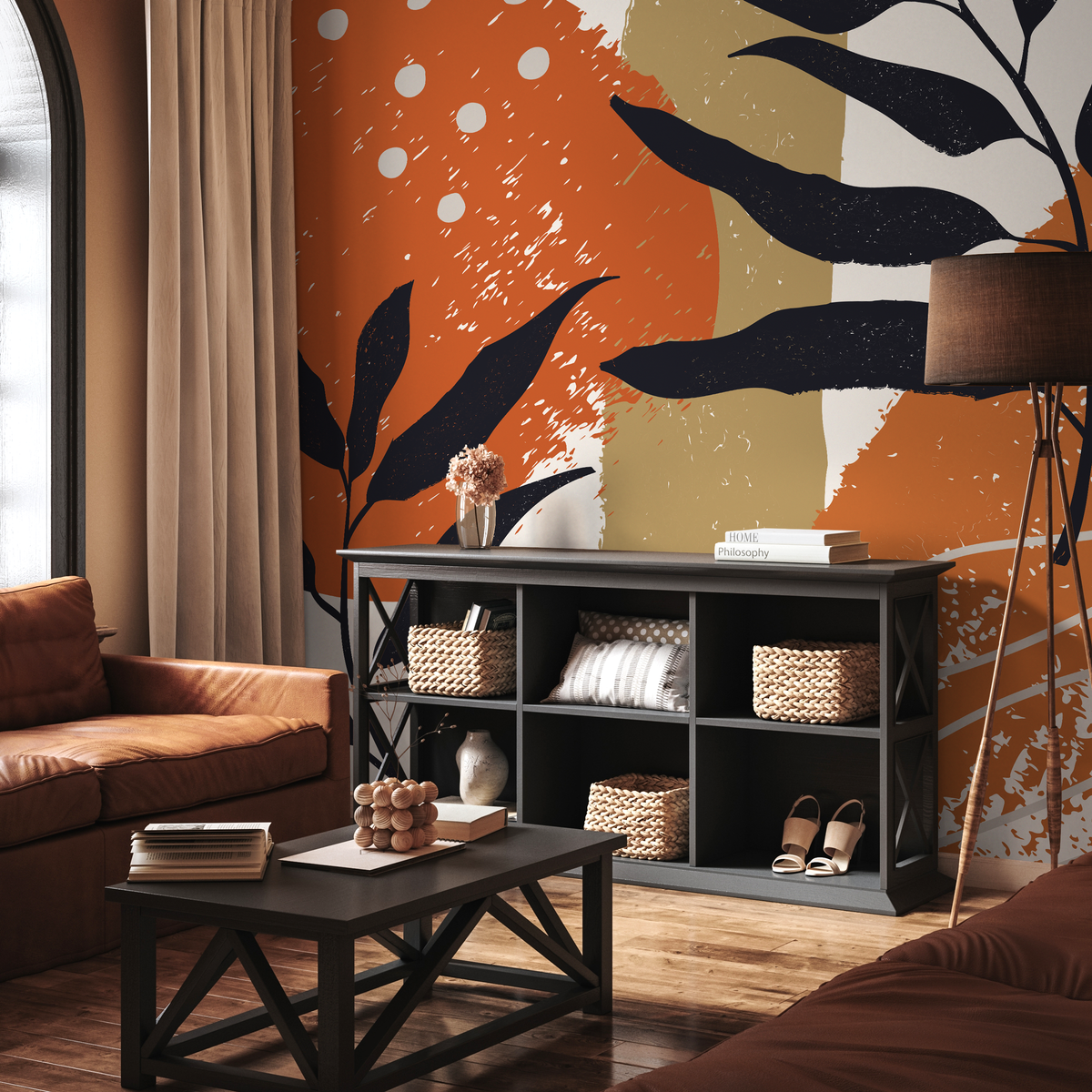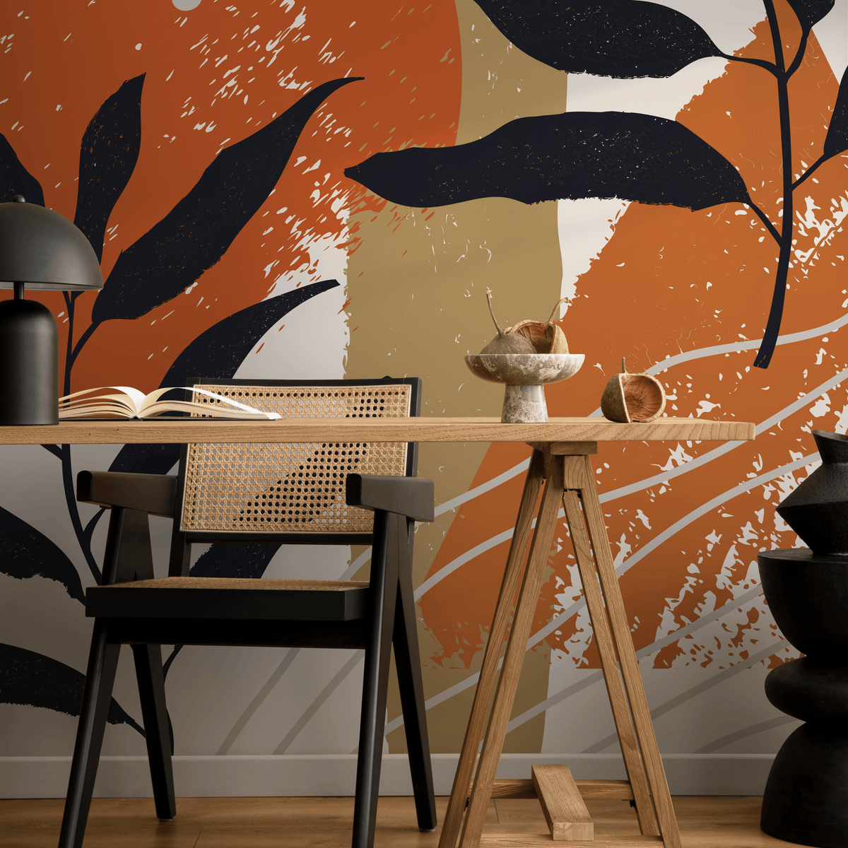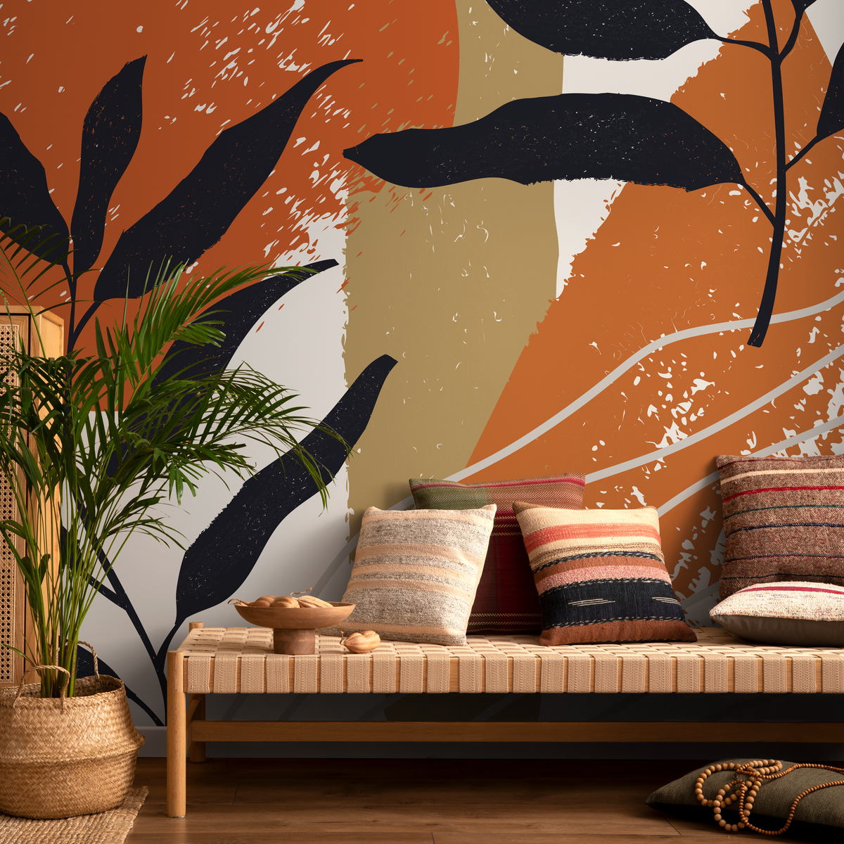 Introduce a bold artistic statement into your home with this Abstract Wallpaper, featuring striking botanical silhouettes. The contemporary design, rendered in a sophisticated palette of terracotta, black, and tan, creates a dynamic and warm atmosphere, perfect for a modern interior design. This high-impact wall art instantly elevates any space, turning a plain wall into a captivating focal point that reflects a chic, artistic sensibility.