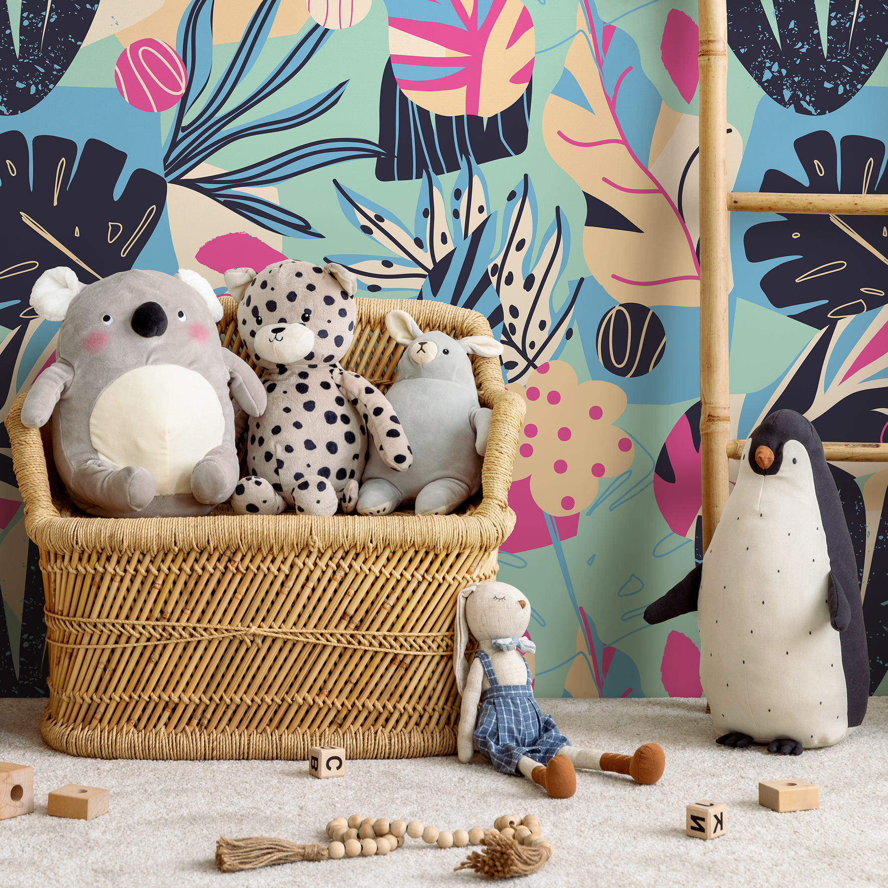 Introduce a burst of creative energy into your home with our Abstract Wallpaper, featuring a dynamic pattern of colorful botanical leaves. This captivating design, rendered in a modern palette of blue, pink, and beige, serves as a stunning piece of wall art that instantly elevates any interior. Perfect for creating a focal point, this wallpaper blends artistic expression with sophisticated home decor, making it an ideal choice for a contemporary living room, a vibrant bedroom, or a playful nursery.