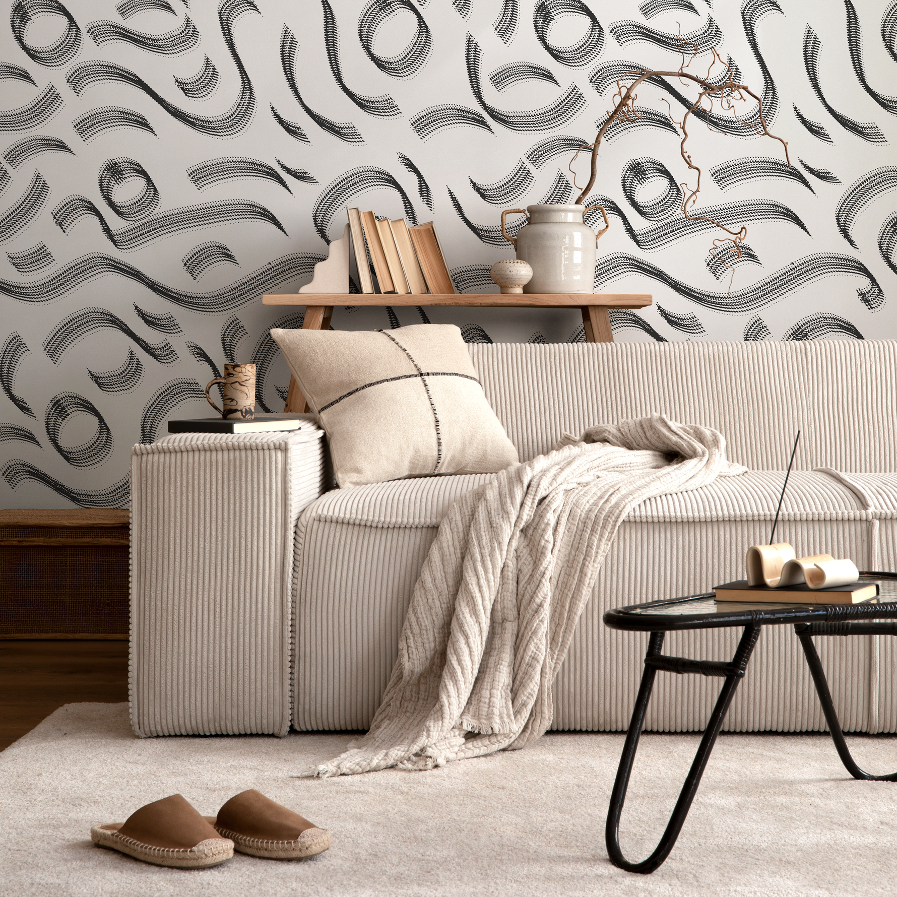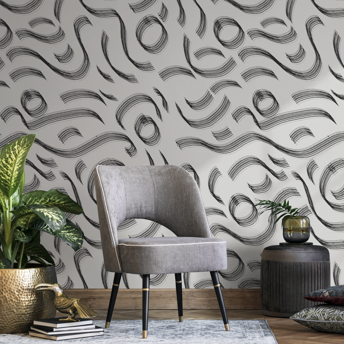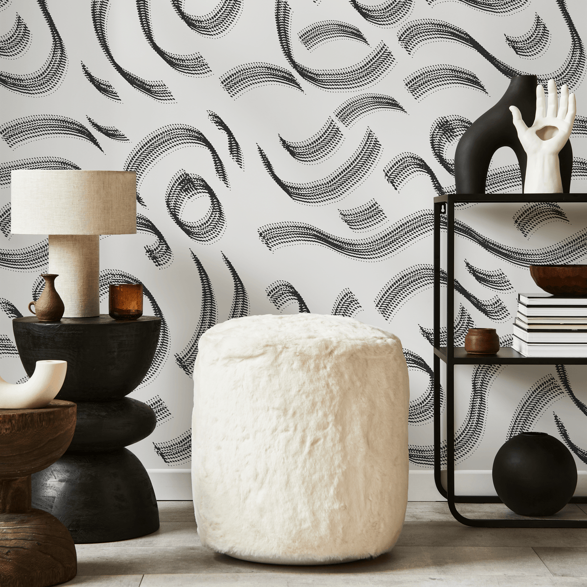Introduce a touch of modern artistry to your home with this Abstract Wallpaper, featuring a dynamic pattern of flowing dotted lines in a classic black and white color scheme. This design serves as sophisticated wall art, instantly creating a focal point and adding a sense of movement to any room. Perfect for those looking to make a statement, this wallpaper transforms your space with its unique, graphic appeal, blending seamlessly into contemporary and minimalist interior design styles.