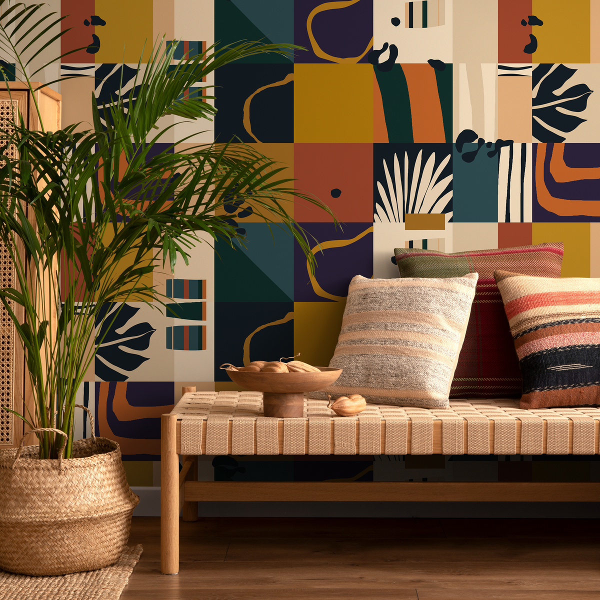 Abstract Wallpaper with Geometric Blocks in Terracotta, Mustard, and Teal - C146