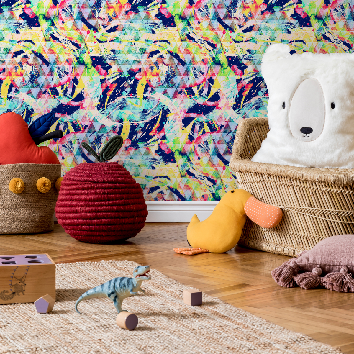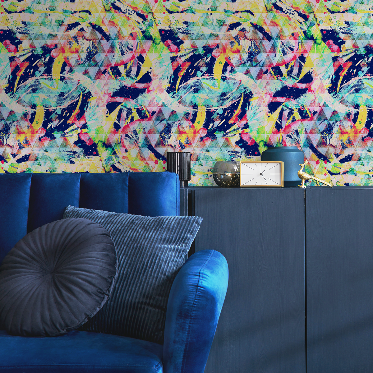 Unleash vibrant energy into your home with this Abstract Wallpaper, featuring a dynamic geometric graffiti motif. The bold design, rendered in striking shades of blue, yellow, and pink, makes a powerful statement, turning any wall into a captivating piece of modern wall art. This wallpaper is perfect for anyone looking to infuse their interior design with a touch of urban sophistication and artistic flair, creating a focal point that is both energetic and stylish.