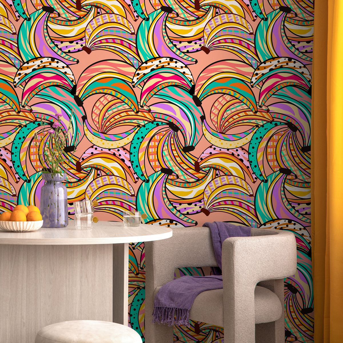Embrace a bold and vibrant aesthetic with our Abstract Wallpaper, featuring a graphic banana motif in a lively palette of pink, yellow, and turquoise. This unique wall art is designed to make a statement, transforming any room into a dynamic and creative space. The pop art-inspired design adds a touch of playful sophistication, perfect for anyone looking to infuse their home decor with energy and personality.