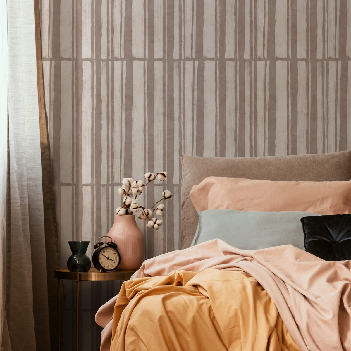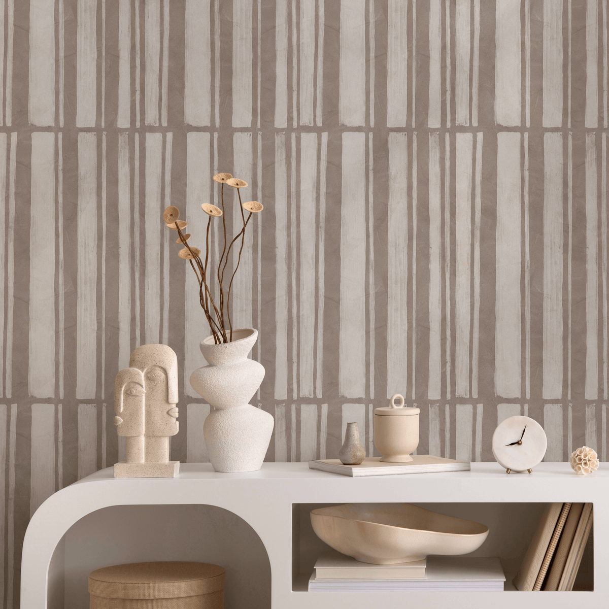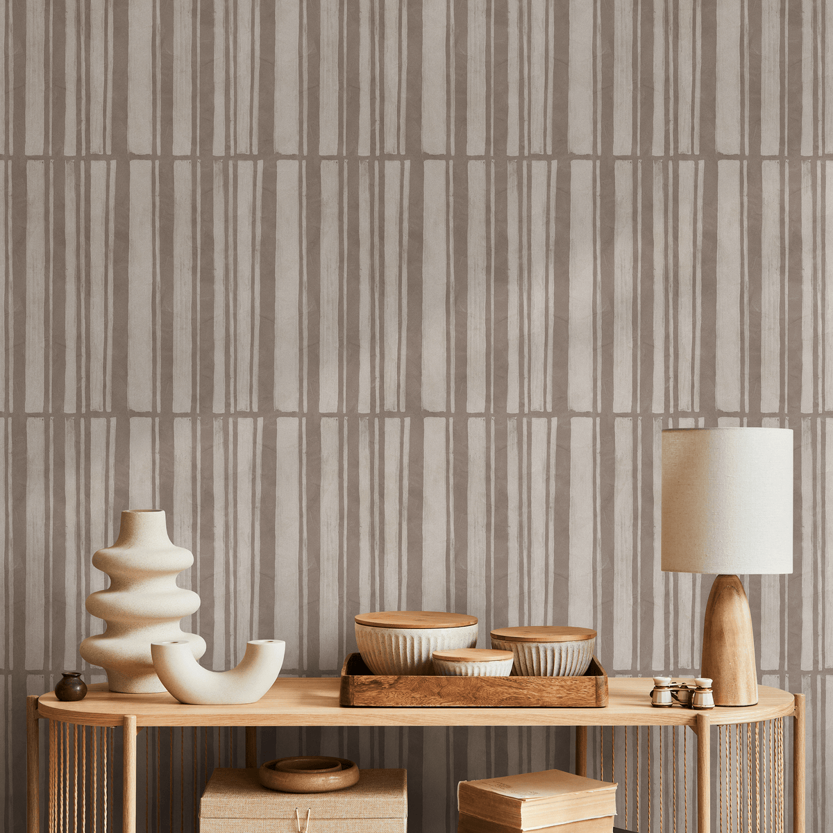 Introduce a sense of organic modernism with our Abstract Wallpaper, featuring hand-drawn vertical stripes in soothing beige and taupe. This unique wall art brings subtle texture and a sophisticated, calming atmosphere to any interior design project. The artistic, brushed lines create a dynamic yet understated pattern, perfect for transforming your space into a stylish sanctuary. Whether you're creating a focal point or covering an entire room, this design adds a touch of bespoke elegance.