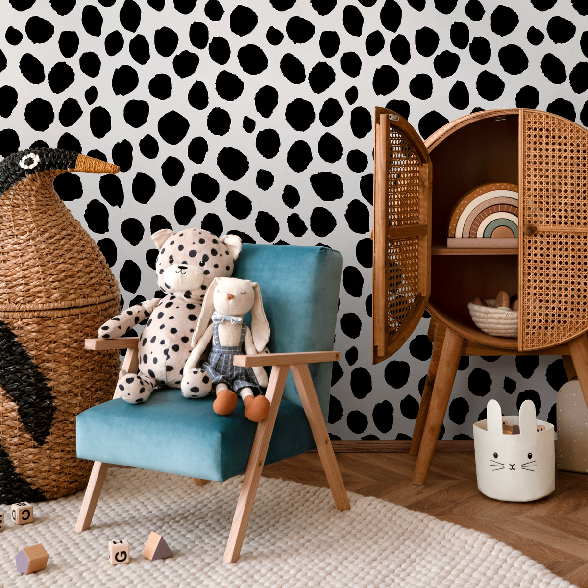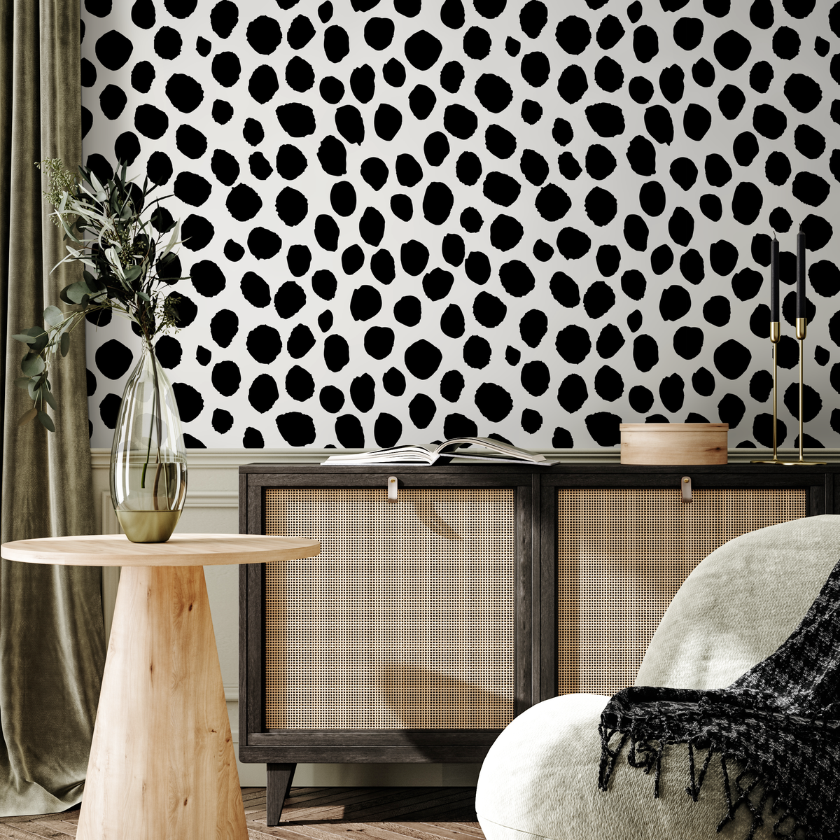 Introduce a bold and modern touch to your space with our Abstract Wallpaper, featuring a striking irregular dot motif. This black and white wallpaper offers a contemporary take on a classic pattern, perfect for creating a statement wall or transforming an entire room. It's a versatile piece of wall art that blends minimalist design with a playful, sophisticated edge, making it an ideal choice for your next home decor project.
