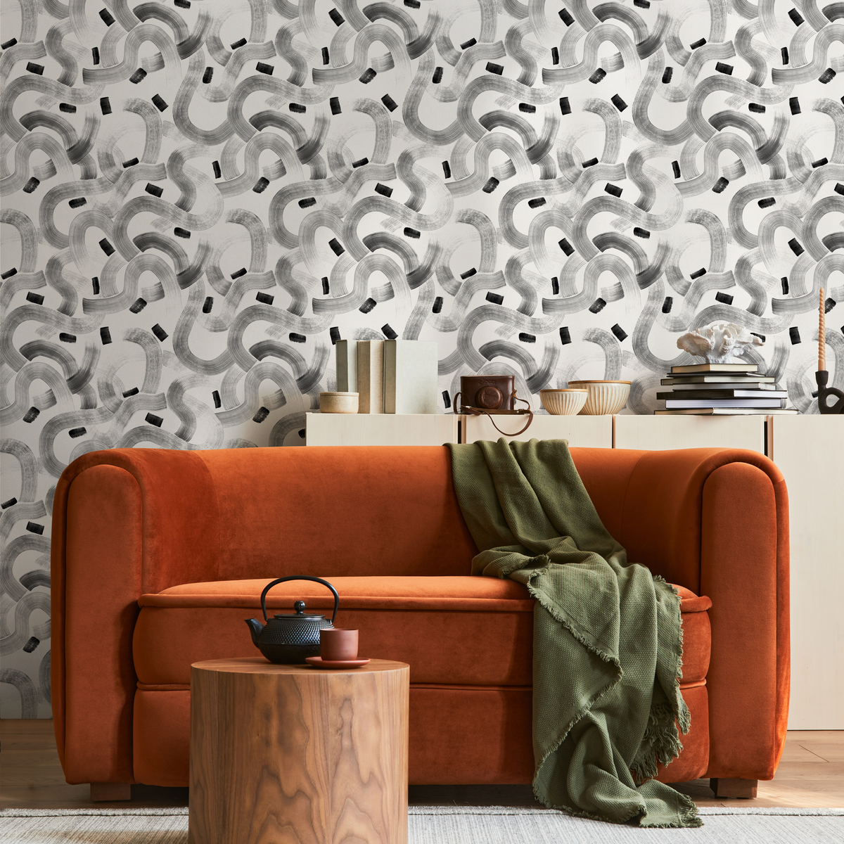 Elevate your interior design with our stunning Abstract Wallpaper, featuring expressive, meandering brush strokes in a sophisticated black and gray palette. This captivating wall art brings a modern, painterly touch to any room, instantly creating a focal point that is both dynamic and chic. The flowing lines and bold marks on a neutral background make it a versatile choice for contemporary home decor.