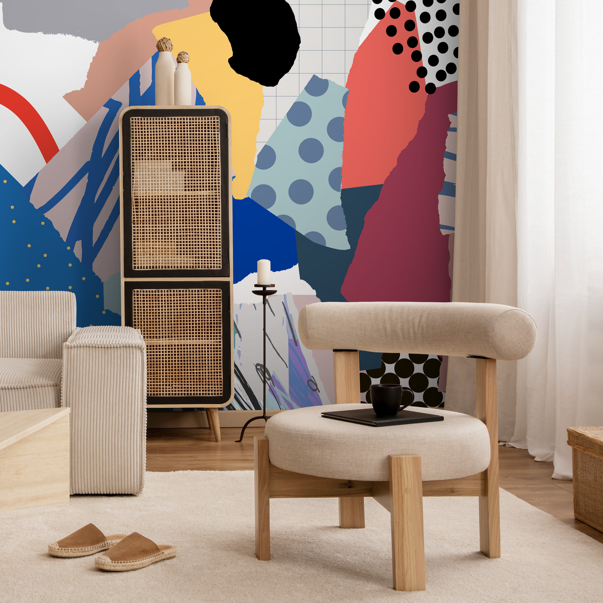 Introduce bold, artistic expression to your home with our Abstract Wallpaper, featuring a dynamic Modern Collage Motif. This stunning wall art combines layered shapes, scribbles, and patterns in a vibrant palette of Blue, Red, and Yellow, creating a powerful focal point for any room. Perfect for those looking to infuse their space with creative energy, this design transforms your walls into a contemporary masterpiece.