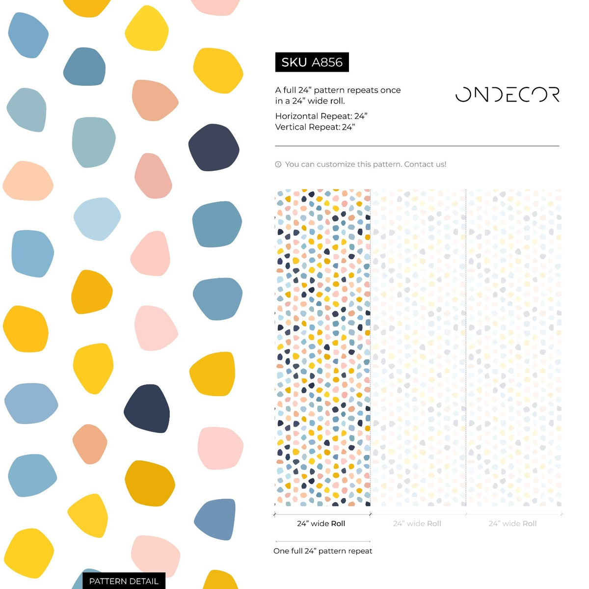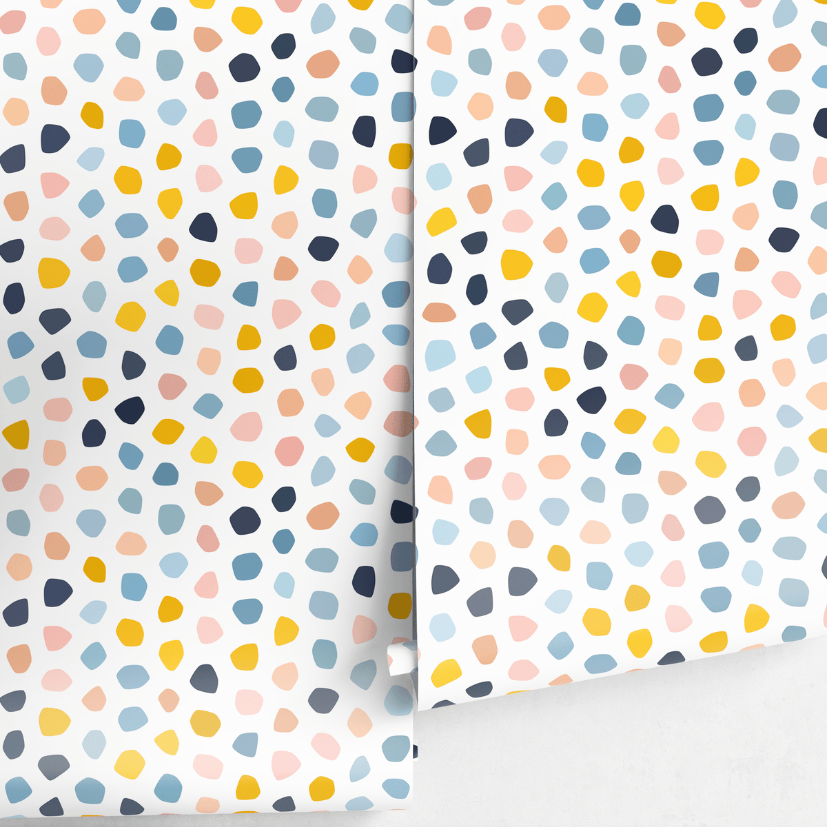 Introduce a touch of modern whimsy to your home with our Abstract Wallpaper, showcasing a delightful pattern of organic pebble shapes. This design features a harmonious blend of blue, yellow, and pink tones, creating a playful yet sophisticated atmosphere. Perfect for transforming any space, this peel and stick wallpaper serves as stunning wall art that instantly brightens your interior design and adds a unique focal point.