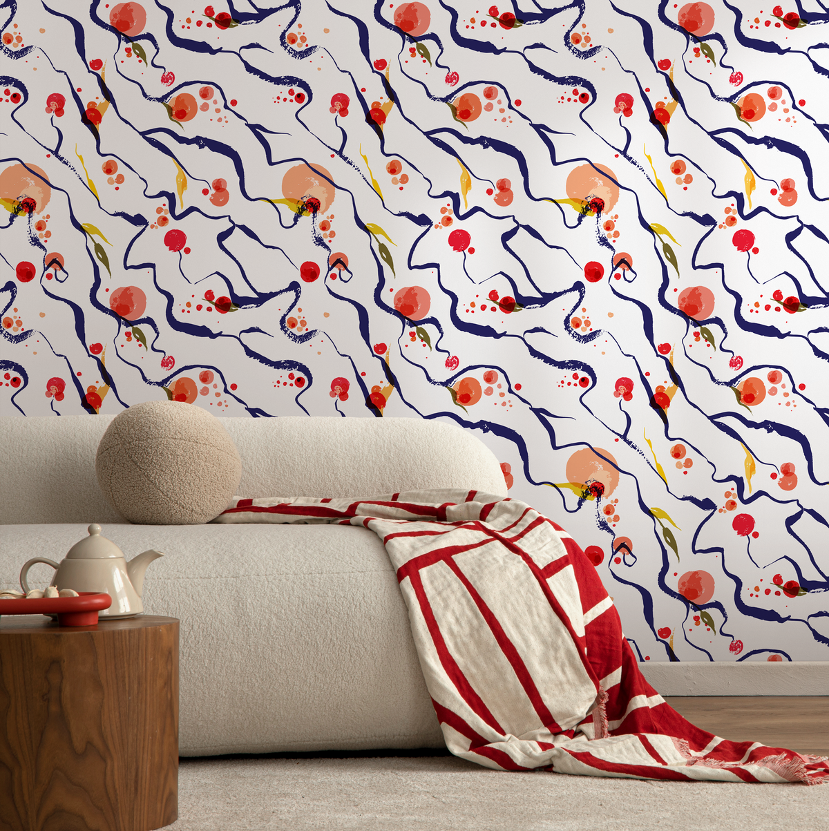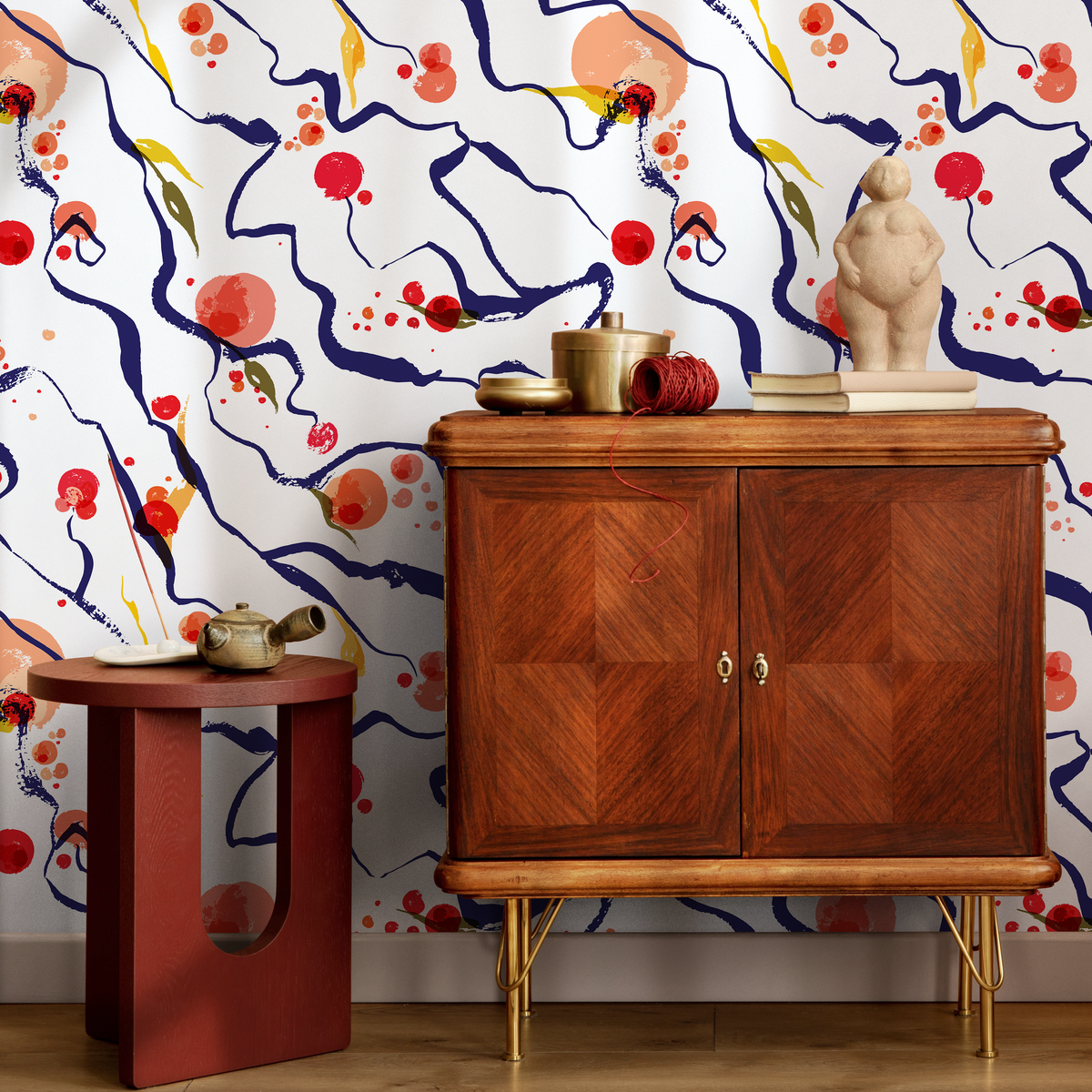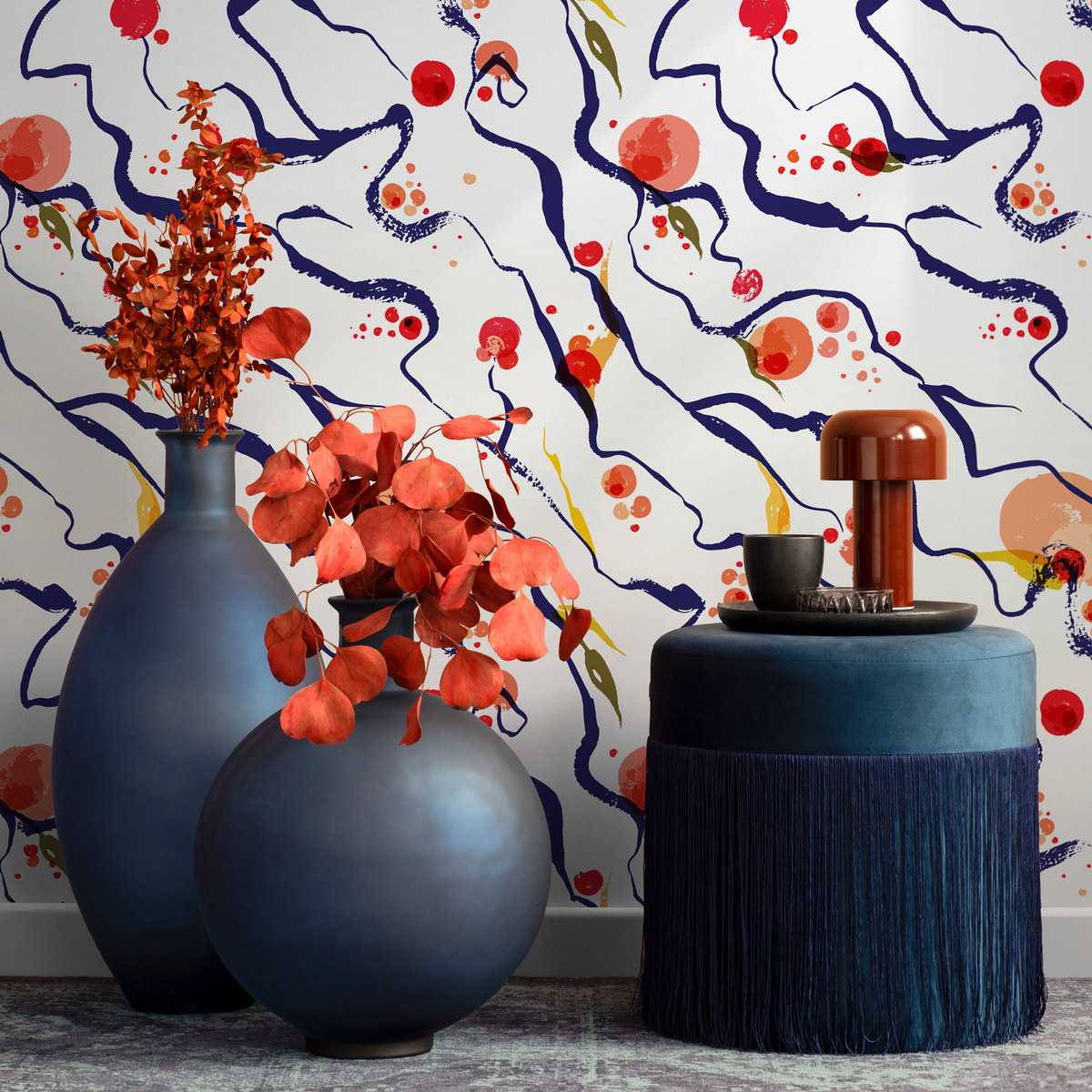Introduce your home to this stunning Abstract Wallpaper, a masterpiece of modern design. Featuring expressive painterly brushstrokes in deep blue, accented with vibrant red and orange abstract berries, this wallpaper brings a dynamic and artistic energy to any interior. The design creates a sophisticated yet playful statement, perfect for anyone looking to infuse their home with unique wall art.