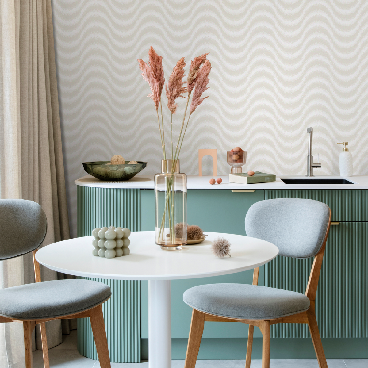 Introduce a sense of calm and sophistication with our Abstract Wallpaper, featuring a soft wavy motif. The gentle, flowing lines in serene beige and cream create a tranquil yet modern atmosphere, making this wall art a perfect choice for subtle elegance. This abstract wallpaper serves as a versatile backdrop, enhancing your space without overwhelming it, ideal for creating a refined and peaceful interior design.