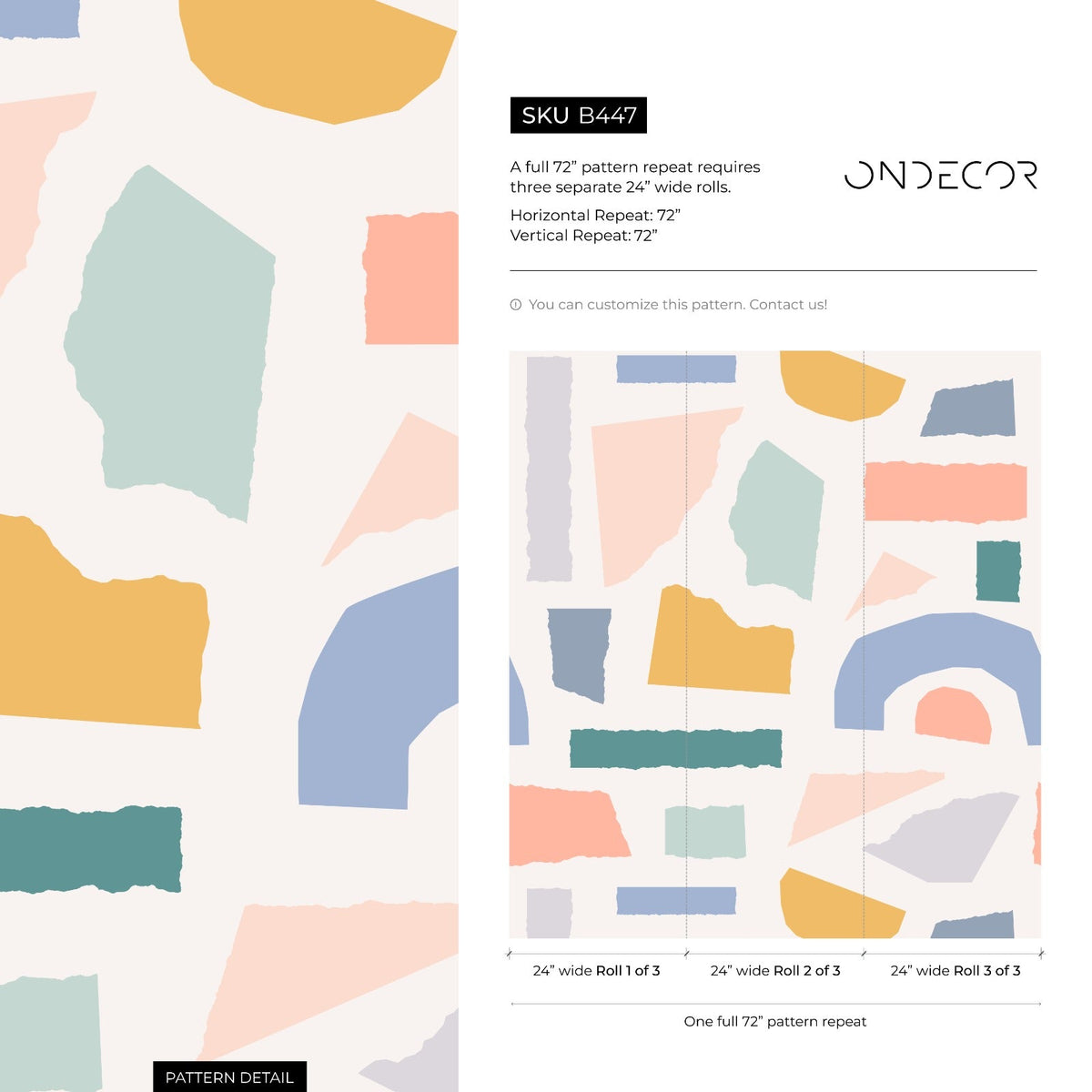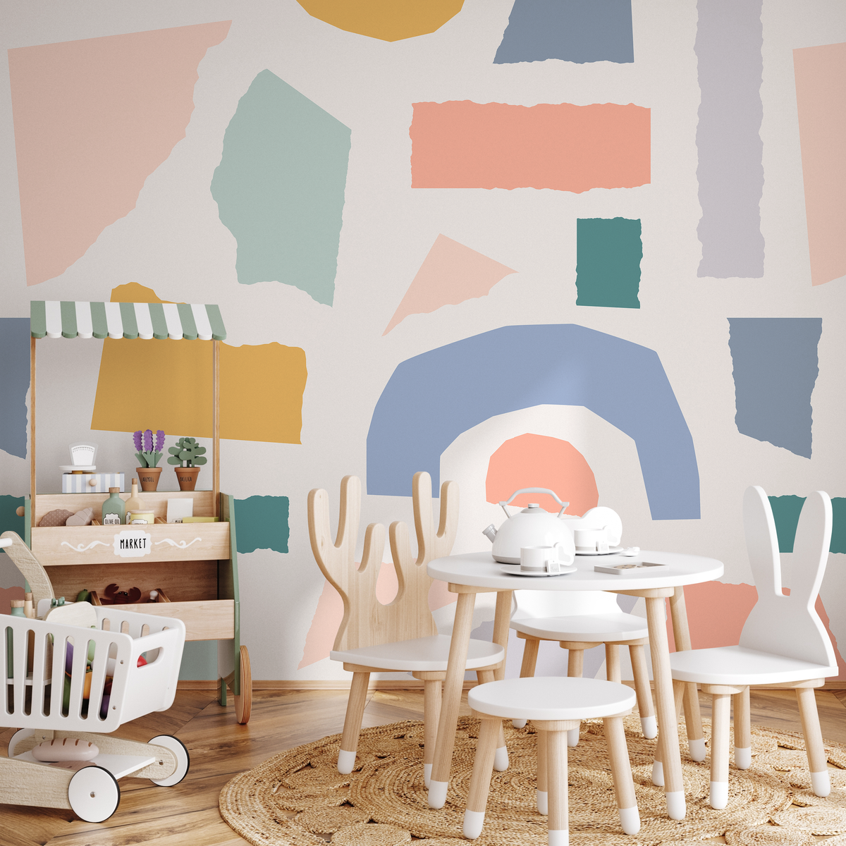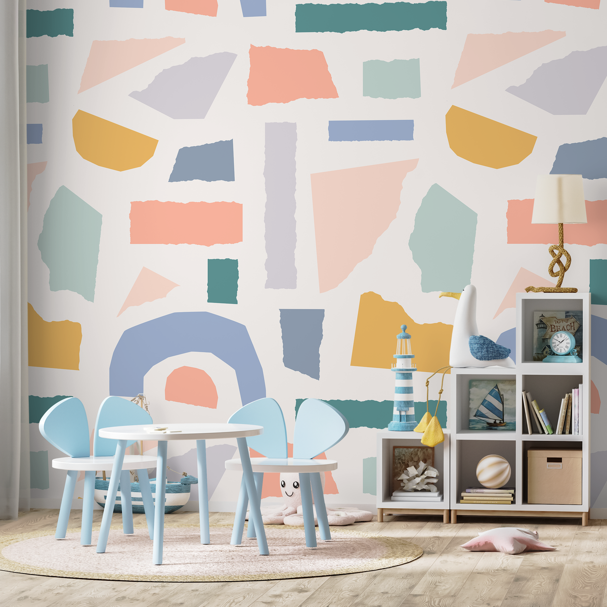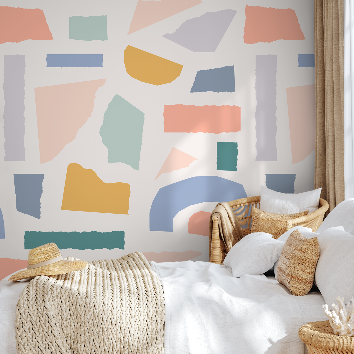 Introduce a touch of modern artistry to your home with our Abstract Wallpaper, featuring a torn paper collage motif. This design showcases a harmonious blend of blue, yellow, and pink shapes, creating a sophisticated yet playful atmosphere perfect for contemporary home decor. The abstract composition serves as a stunning piece of wall art, instantly elevating your interior design with its unique and creative aesthetic.