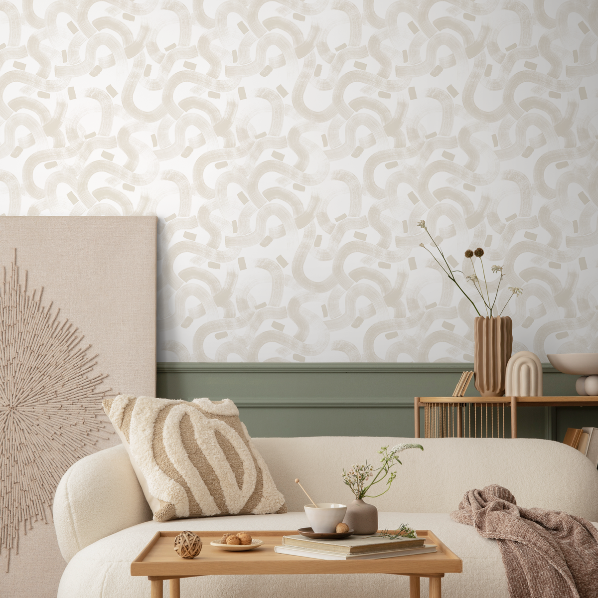 Abstract Wallpaper with Wavy Brushstroke Lines in Beige and White - C880
