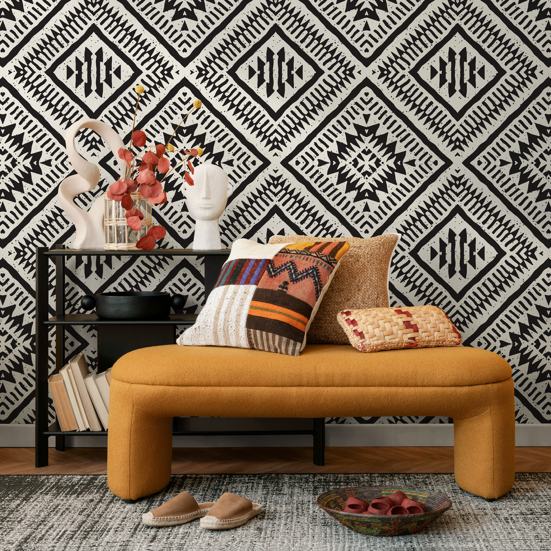 Our peel and stick wallpaper makes room transformation effortless. Ideal as a dramatic accent wall or for a full room makeover, this removable wallpaper is a versatile choice for your living room, bedroom, or home office. The bold geometric design serves as an incredible backdrop for modern, minimalist, or bohemian decor, allowing you to express your unique style with high-impact wall art that is both elegant and easy to apply.