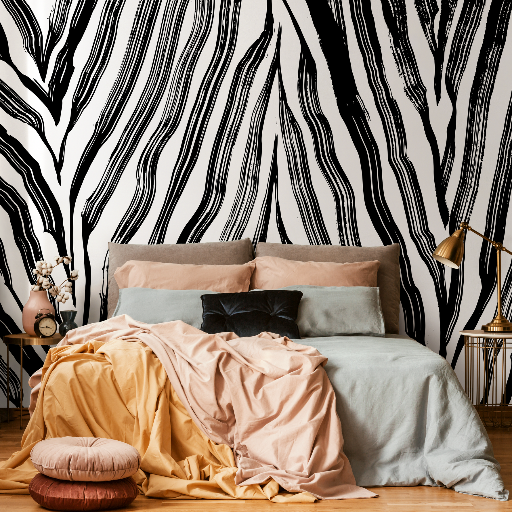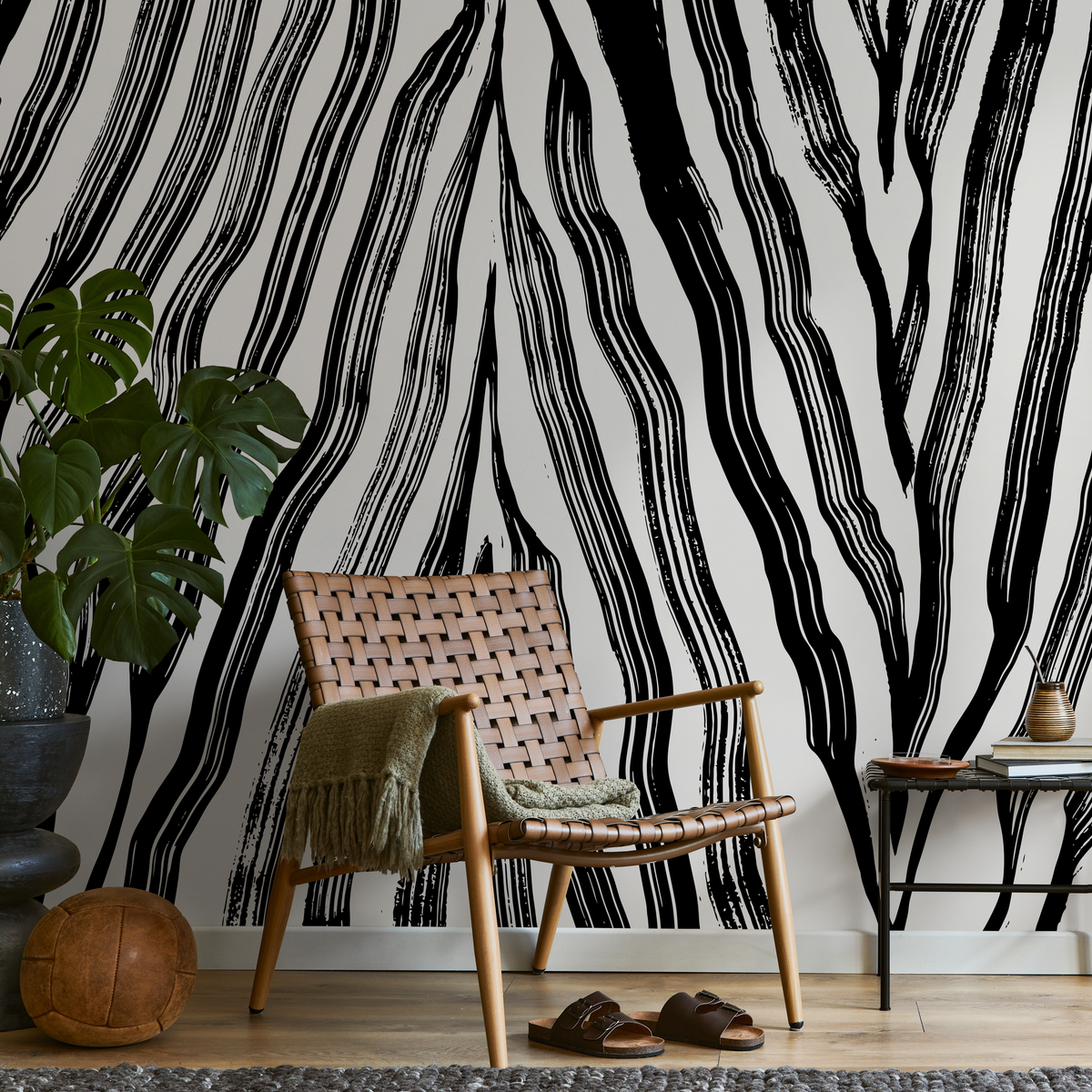 Unleash your wild side with this stunning Animal Print Wallpaper, featuring a bold zebra stripe motif in a classic black and white color scheme. This striking design serves as the perfect wall art to create a dramatic focal point, instantly elevating your home decor. The graphic, hand-brushed appearance of the stripes adds a touch of artistic flair, making it an ideal choice for a sophisticated and modern interior design.