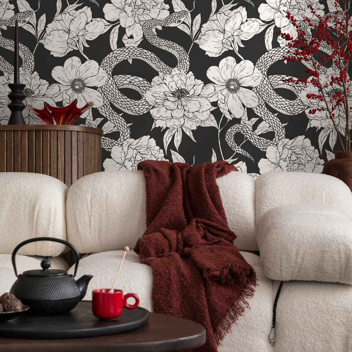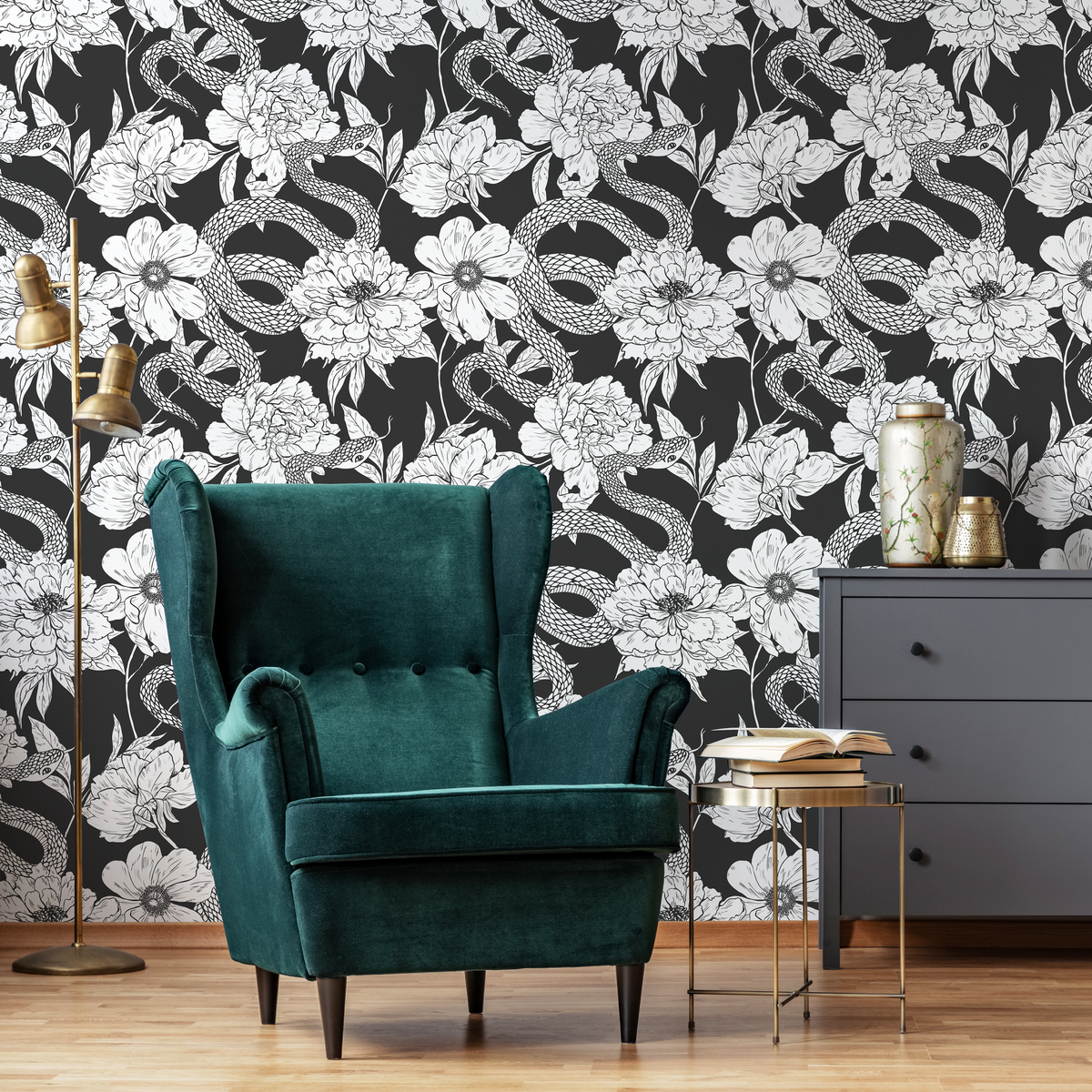 Introduce a touch of dramatic elegance to your home with this Animal Wallpaper, featuring a sophisticated design of winding serpents and peonies. The striking gray and black color palette creates a bold statement, perfect for transforming any room into a captivating work of art. This unique serpent and peony motif offers an edgy yet classic look, making it an exceptional choice for modern home decor and interior design projects.