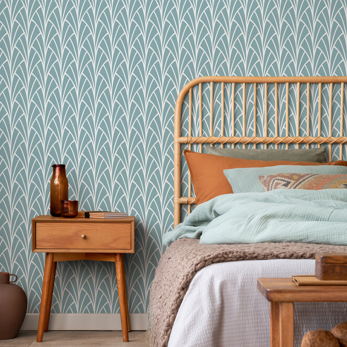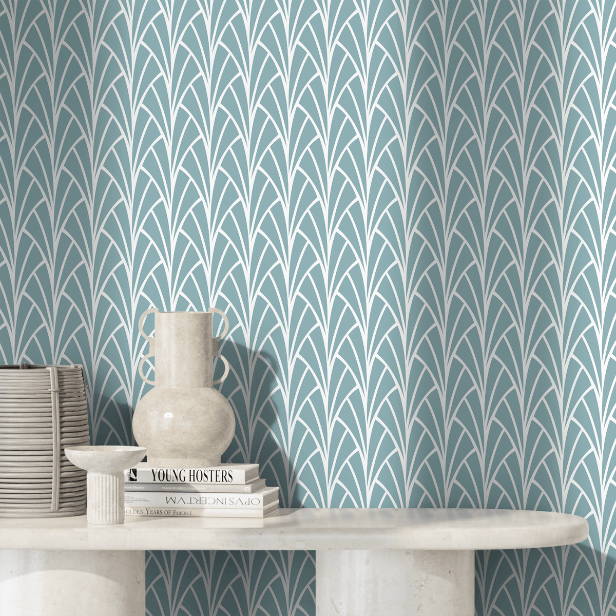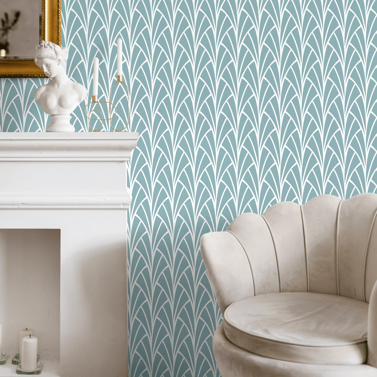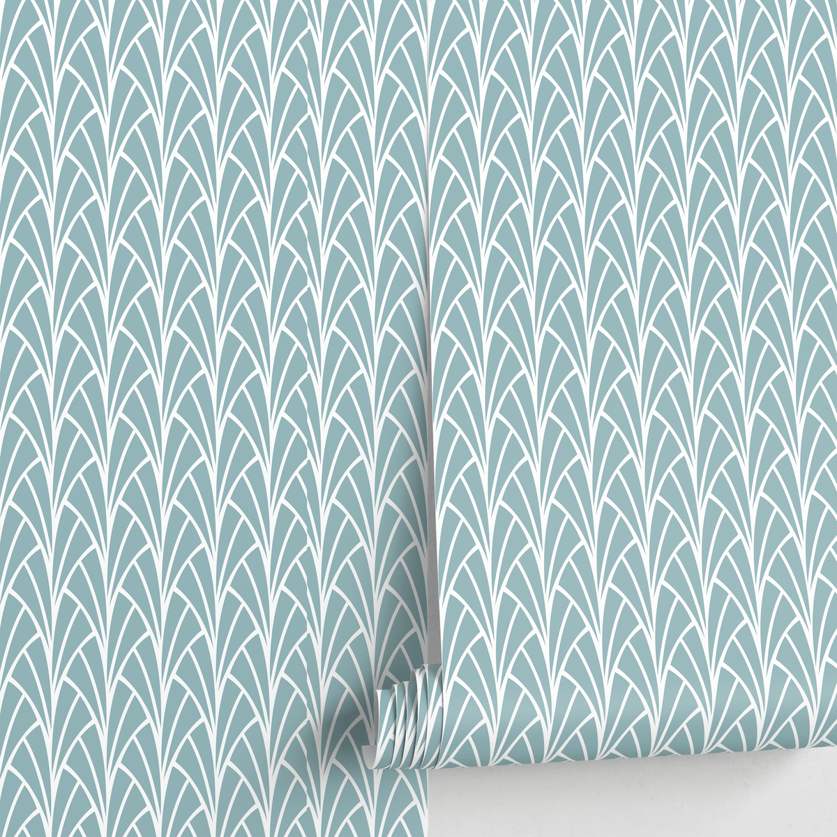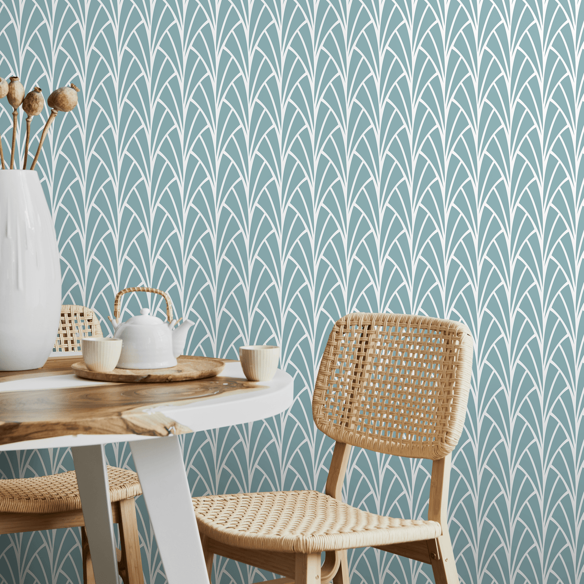 Introduce timeless elegance into your home with this stunning Art Deco Wallpaper. Featuring a sophisticated pattern of fanning fronds in classic blue and white, this wallpaper creates a chic and geometric statement perfect for any modern interior design. The elegant motif adds a touch of 1920s glamour, effortlessly transforming your space into a work of art. This design is perfect for creating a memorable accent wall or decorating an entire room with its captivating rhythm and style.