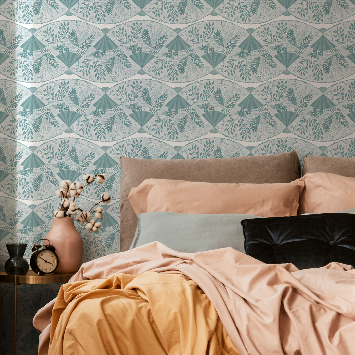 Introduce timeless elegance to your home with our Art Deco Wallpaper, featuring a sophisticated floral fan motif. This light blue and white wallpaper design blends classic Chinoiserie-inspired fans with delicate botanical details, creating a balanced and serene pattern perfect for any interior design. The intricate linework and scalloped arrangement offer a unique visual texture that elevates your wall art from a simple background to a stunning focal point.