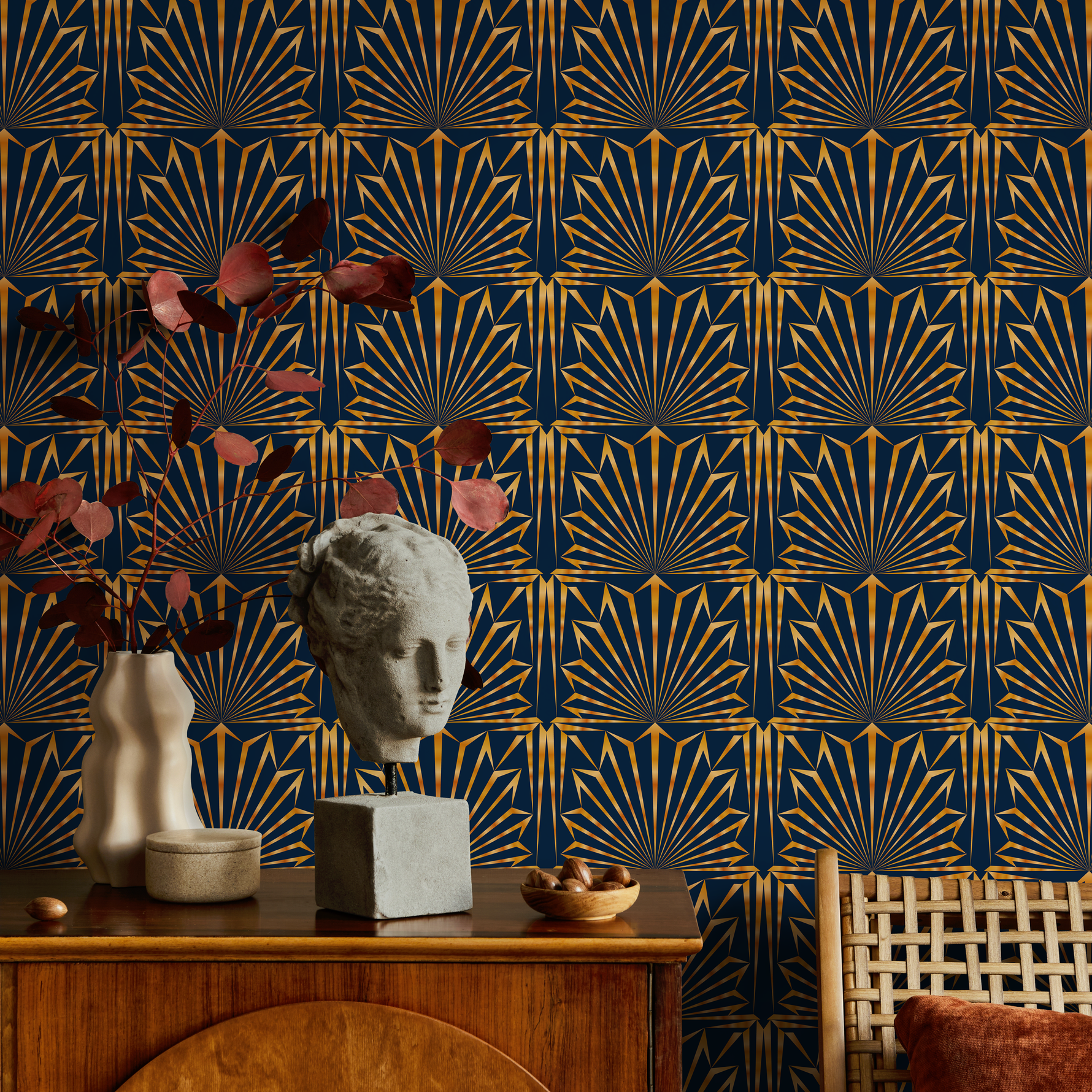 Introduce timeless glamour into your space with our stunning Art Deco Wallpaper in rich navy blue and gold. This elegant wall art features a sophisticated geometric fan motif, perfect for creating a luxurious and dramatic statement. The bold lines and classic color palette make this wallpaper an ideal choice for anyone looking to infuse their home decor with the opulent spirit of the Roaring Twenties, transforming any room into a work of art.