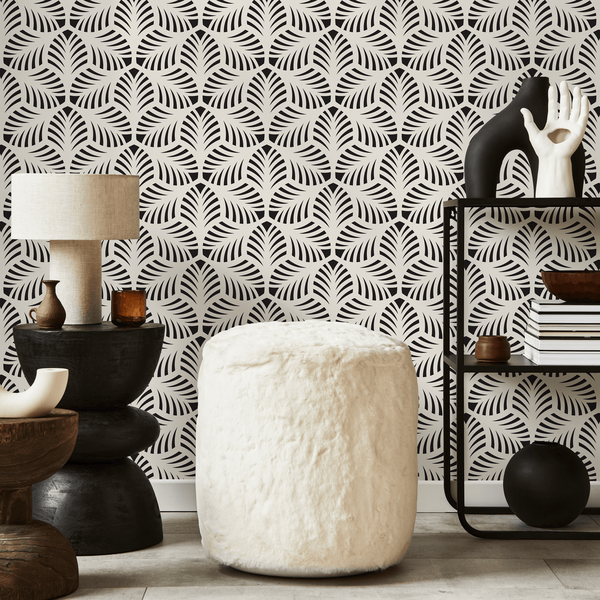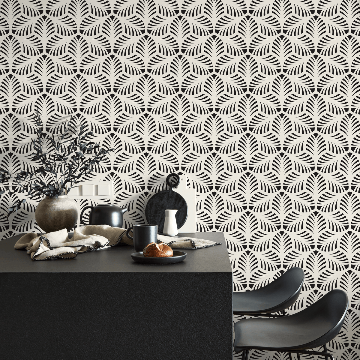 Elevate your interior with this stunning Art Deco Wallpaper, featuring a bold geometric fan pattern in a sophisticated black and cream palette. This eye-catching wall art is perfect for creating a dramatic accent wall or transforming an entire room with its timeless elegance. The intricate, repeating motif adds depth and character, making it an ideal choice for anyone looking to infuse their home decor with a touch of classic glamour and modern style.