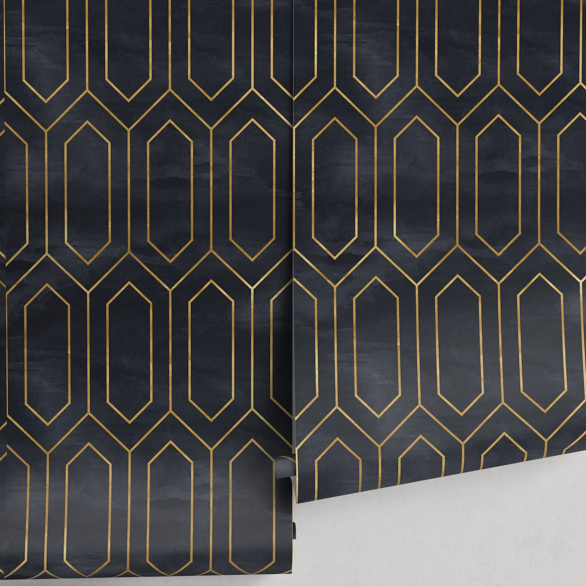 Introduce timeless elegance to your space with this stunning Art Deco Wallpaper. Featuring a sophisticated geometric honeycomb motif in classic Black and Gold, this design creates a bold and luxurious statement perfect for elevating your home decor. The striking gold lines on a deep black background provide a dramatic and opulent feel, turning any wall into a captivating piece of art.