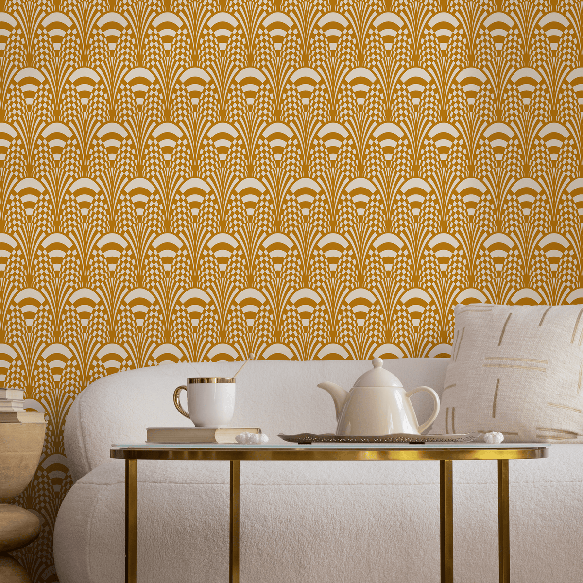 Introduce timeless elegance to your home with our Art Deco Wallpaper, featuring a sophisticated stylized fan motif. The striking yellow and white color palette brings a classic yet bold statement to any room, perfectly capturing the essence of Mid-Century Modern and retro interior design. This high-quality wall art is designed to transform your space, whether you're creating a stunning accent wall or decorating an entire room. Our removable wallpaper makes it easy to achieve a professional look with minimal effort, providing a perfect solution for a quick and impactful home decor update.