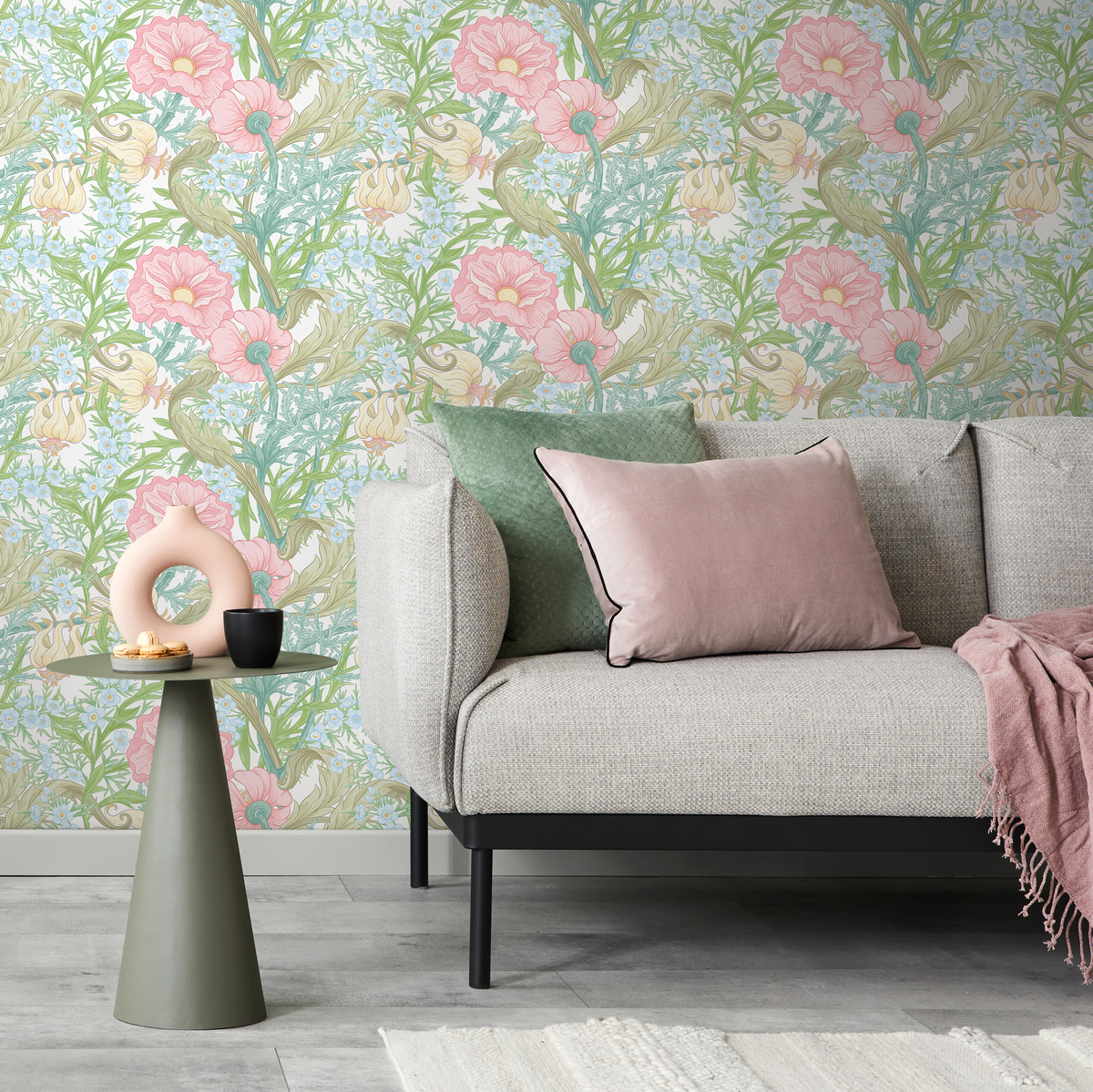 Discover the timeless elegance of our Art Nouveau Wallpaper, featuring a sophisticated pattern of elegant blooms in delicate shades of pink, blue, and green. This stunning floral wallpaper is the perfect way to create a classic accent wall or transform an entire room with its intricate, flowing design. Ideal for bringing a touch of vintage charm into modern interior design, this wall art enhances any space with its graceful and organic motif.