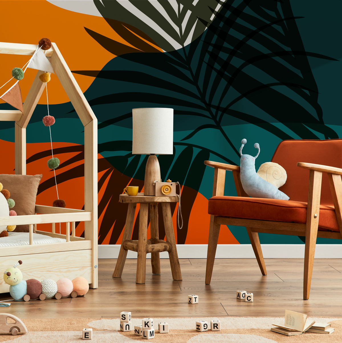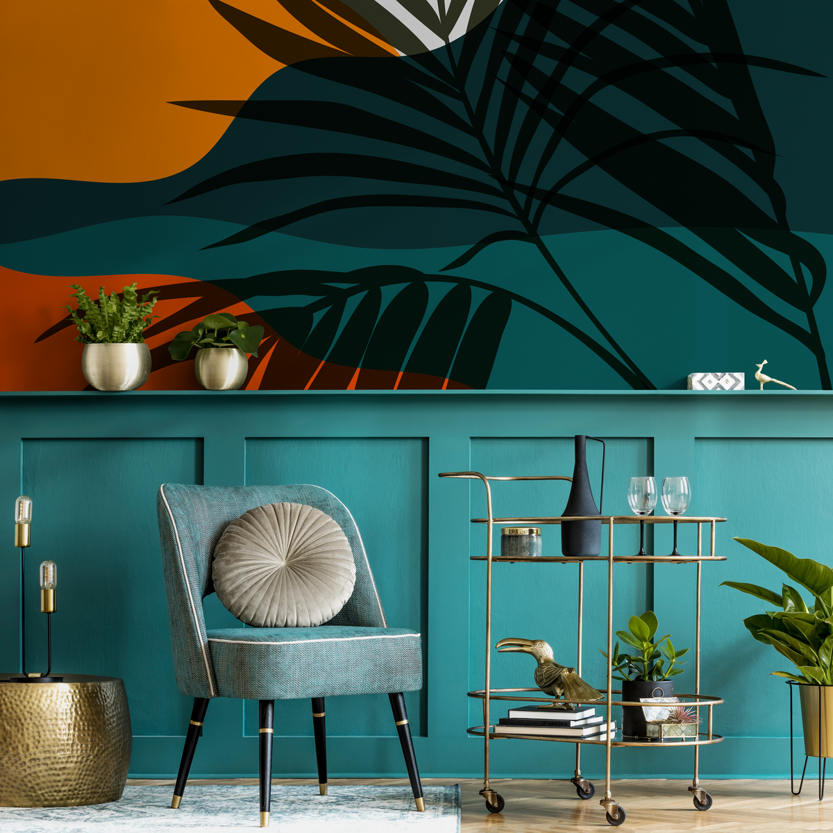 Introduce a bold, modern aesthetic into your home with this stunning Botanical Wallpaper. Featuring a dynamic composition of abstract palm leaf silhouettes, this design uses a striking palette of deep teal, golden yellow, and rich green to create a captivating piece of wall art. Perfect for crafting an unforgettable accent wall, this tropical leaves mural wallpaper transforms any room into a stylish sanctuary, blending natural motifs with contemporary abstract forms for a truly unique look.