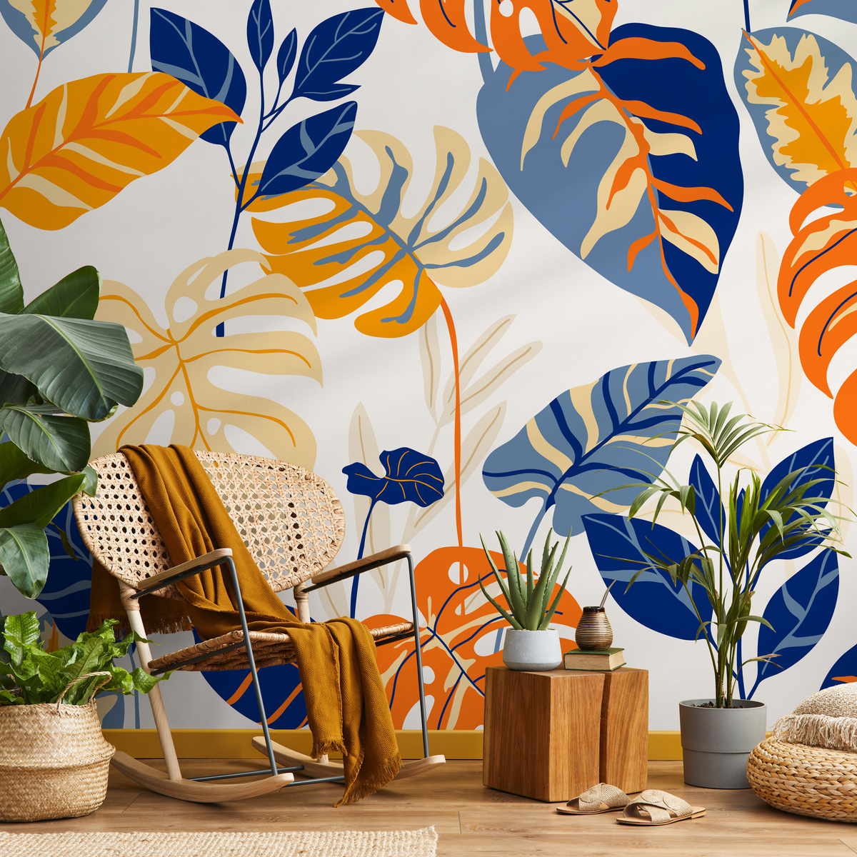 Introduce a burst of modern energy into your home with this stunning Botanical Wallpaper. The design showcases bold tropical leaves, including stylized monstera, in a vibrant and contemporary palette of deep blue, bright orange, and golden yellow. This wall art is perfect for creating an eye-catching accent wall or transforming an entire room, adding a sophisticated touch of nature-inspired flair to your interior design.