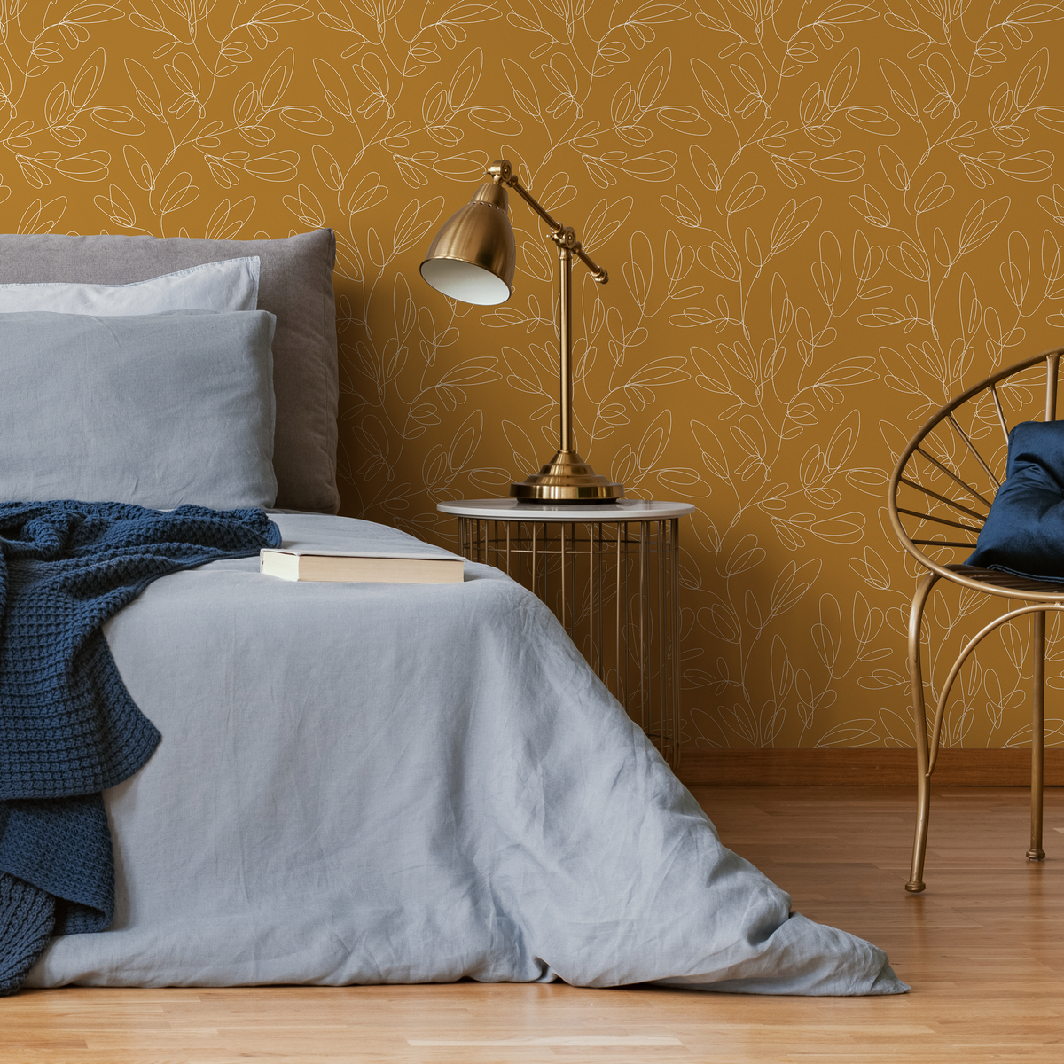 Introduce a touch of sophisticated nature to your home with this stunning Botanical Wallpaper. Featuring a delicate leaf outline in a continuous line art style, this design brings an elegant and modern feel to any space. The rich mustard yellow and white color palette creates a warm, inviting atmosphere, making it the perfect wall art to refresh your interior design. This abstract boho floral wallpaper is ideal for creating a statement wall or transforming an entire room with its unique and artistic charm.